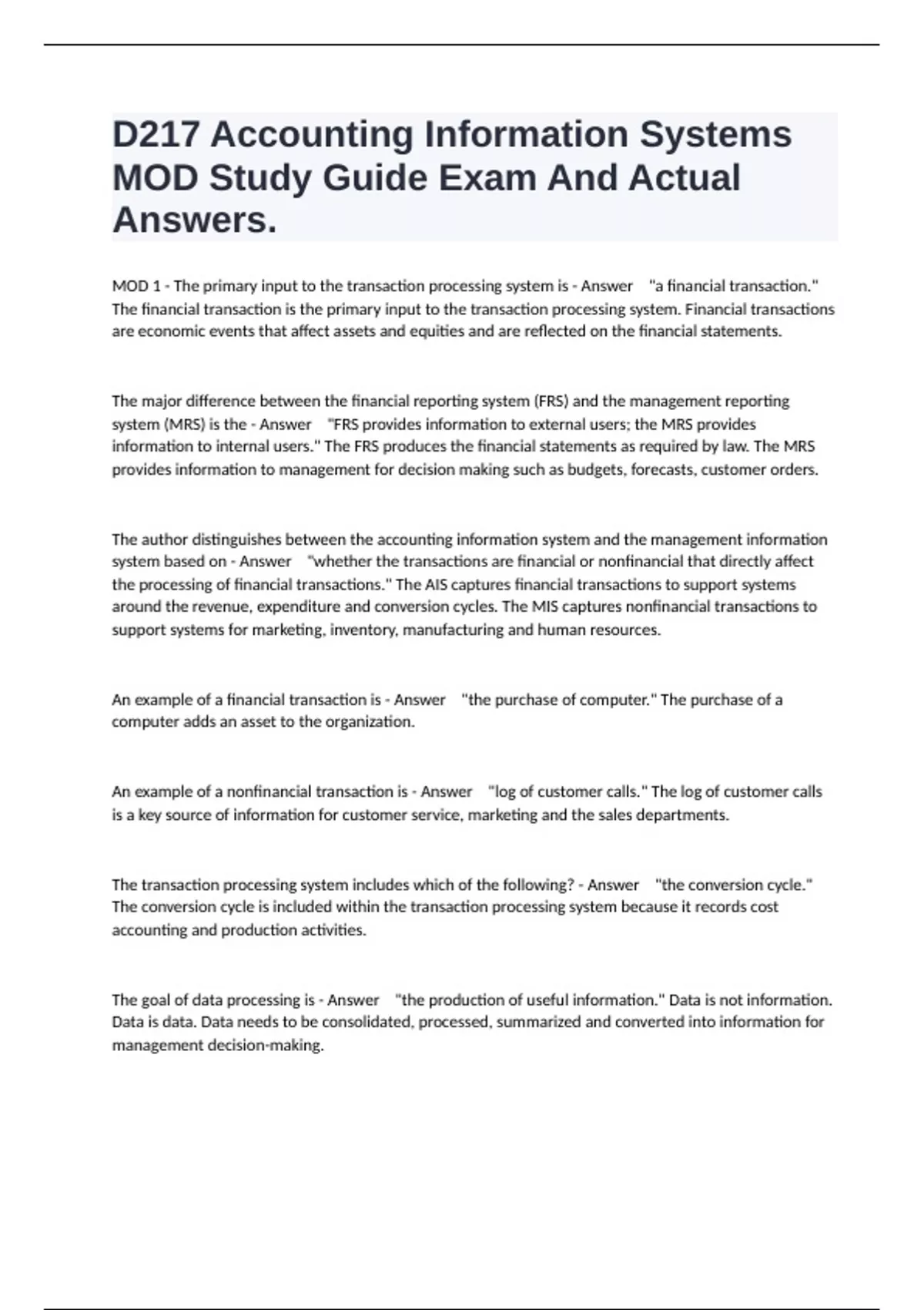 1 Exam (elaborations) WGU D217 Accounting Information Systems Training Exam Questions And Correct Answers. 2 Exam (elaborations) WGU D217 Accounting Information Systems Prep Exam And Correct Answers. 3 Exam (elaborations) WGU D104 Intermediate Accounting II Units 4-6 Final Review Exam And 100% Solved Answers. 4 Exam (elaborations) WGU C217 Pract