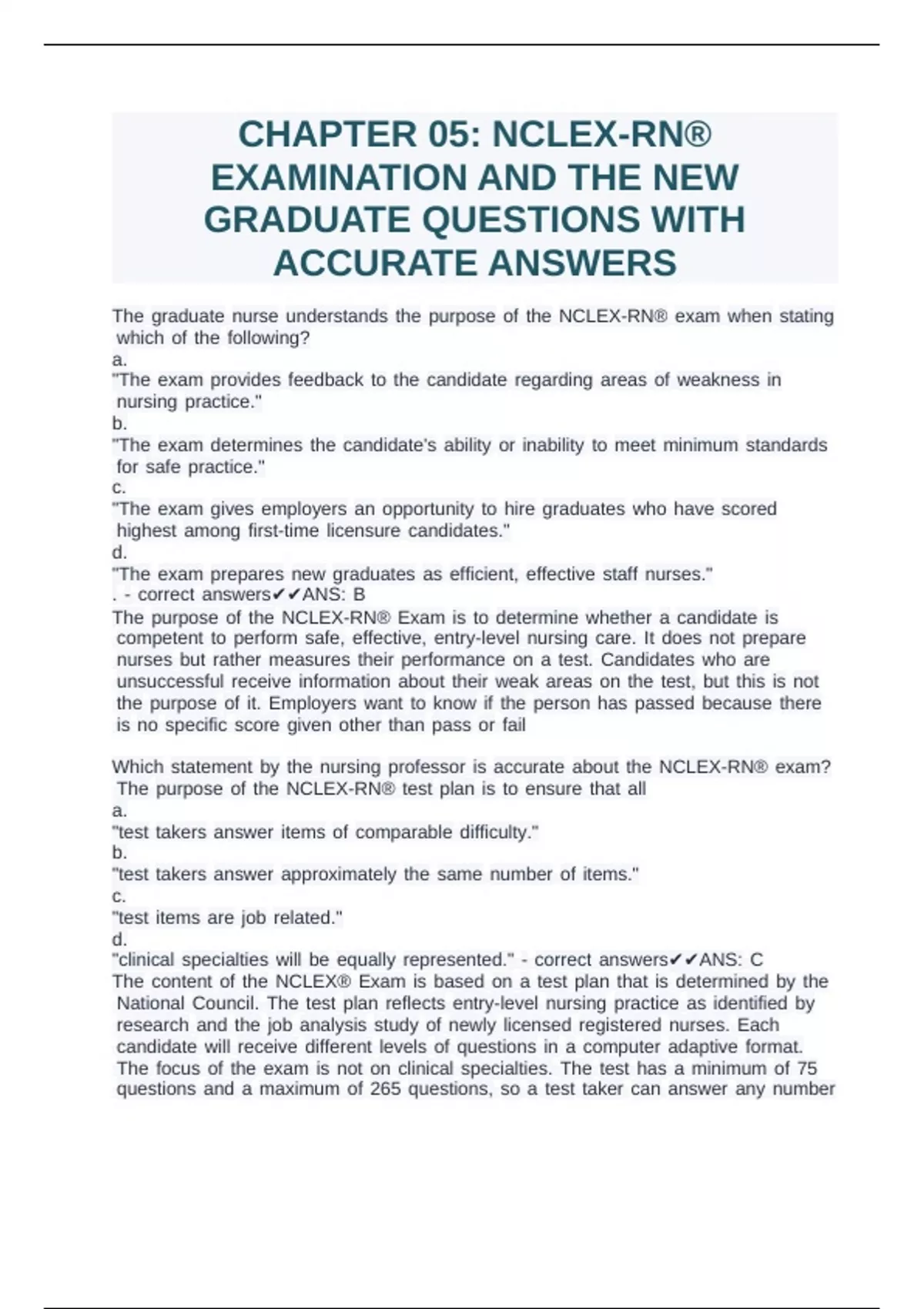 CHAPTER 05: NCLEX-RN® EXAMINATION AND THE NEW GRADUATE QUESTIONS WITH ACCURATE ANSWERS