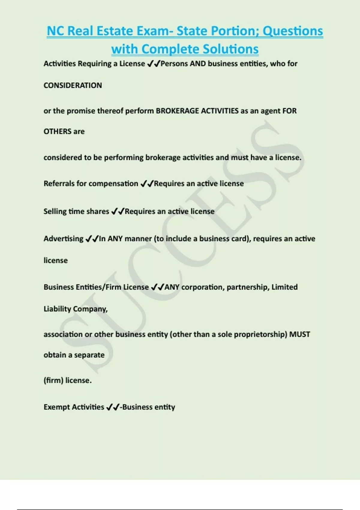 NC Real Estate Exam- State Portion; Questions with Complete Solutions 2 Exam (elaborations) NC Real Estate License Law; Questions with Complete Solutions 3 Exam (elaborations) North Carolina Real Estate (State Only Exam Review); Questions with Complete Solutions 4 Exam (elaborations) N.C. Real estate pre-licensing; Questions with Complete Soluti