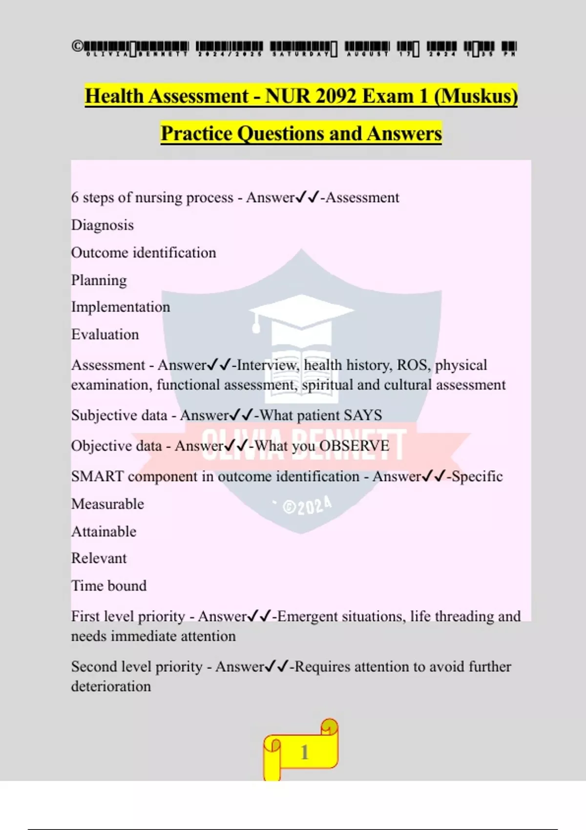 Health Assessment - NUR 2092 Exam 1 (Muskus) Practice Questions and Answers
