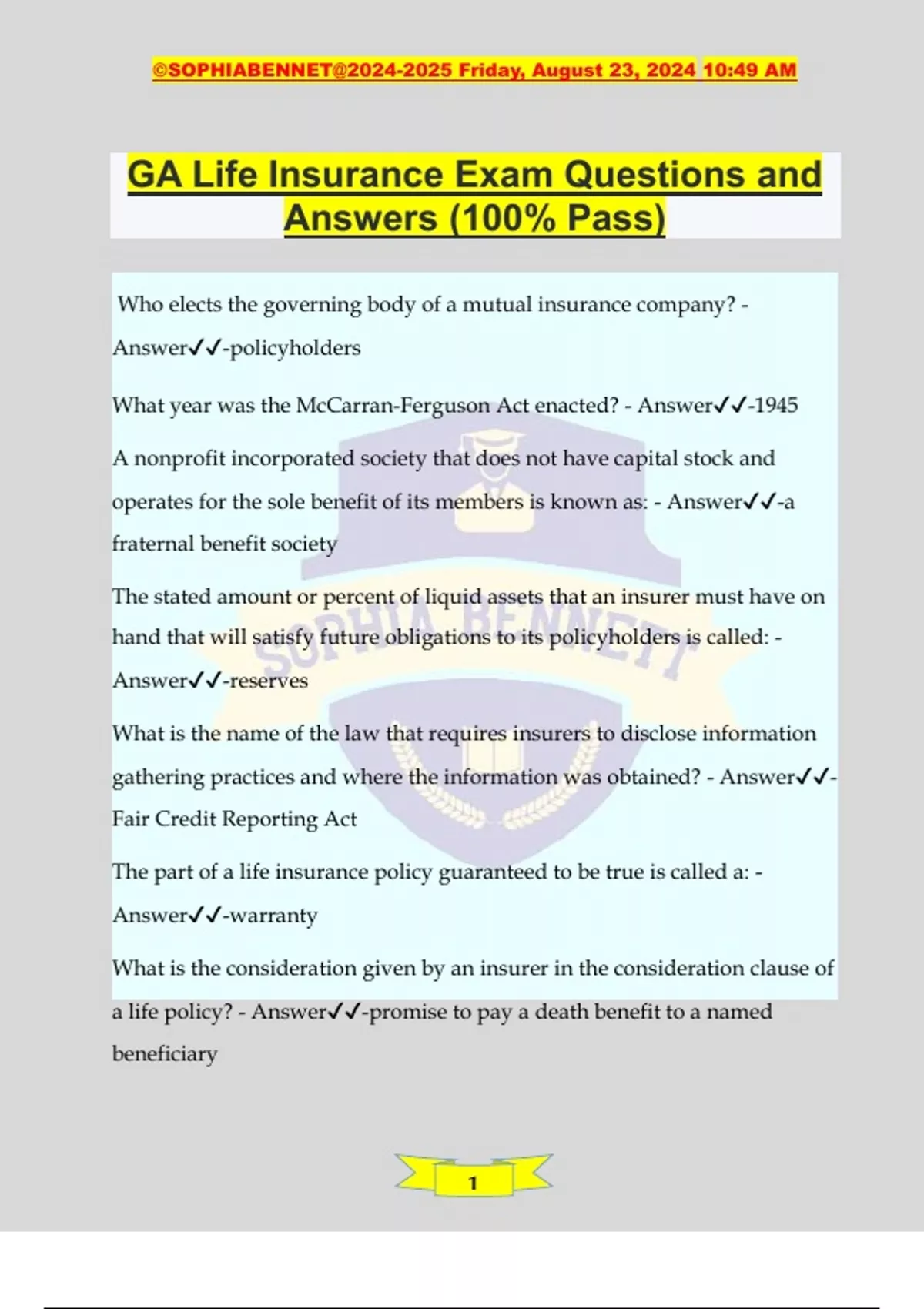 GA Life Insurance Exam Questions and Answers (100% Pass)