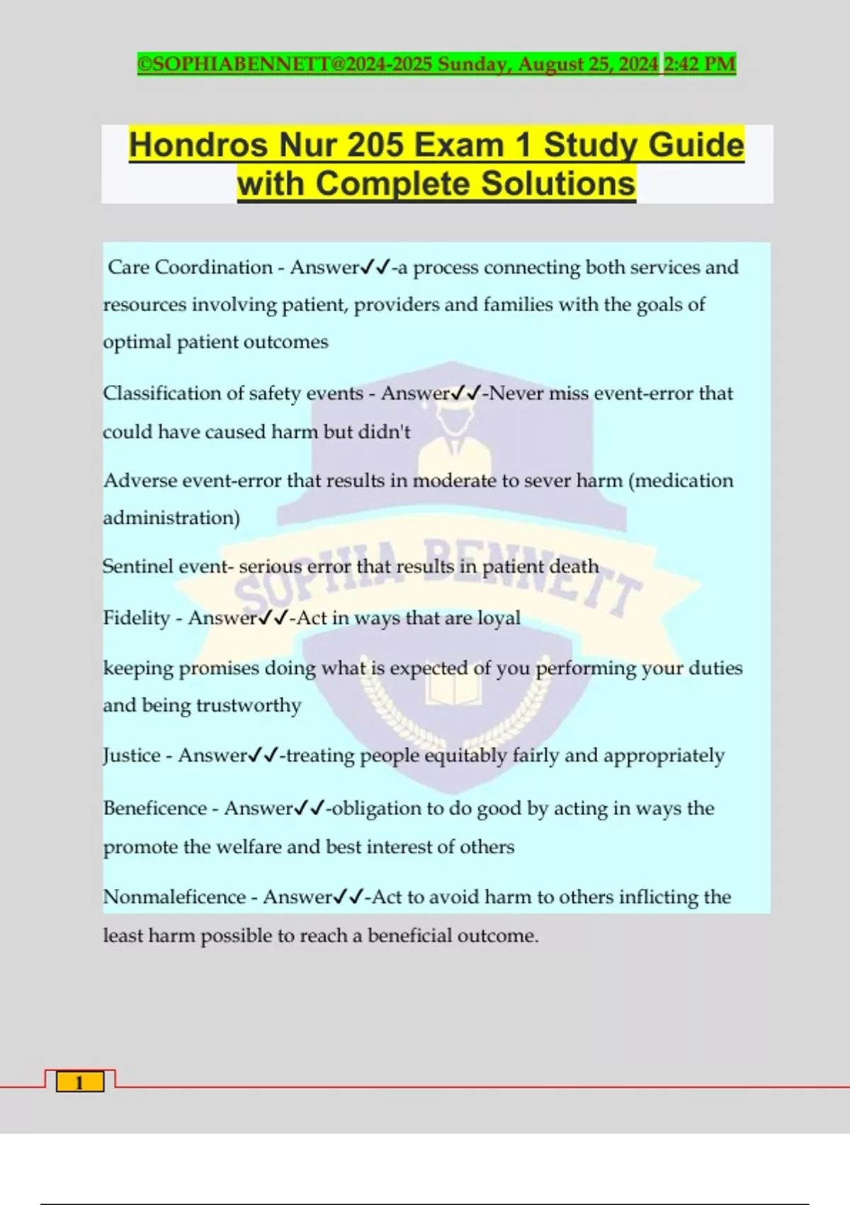 Hondros Nur 205 Exam 1 Study Guide with Complete Solutions
