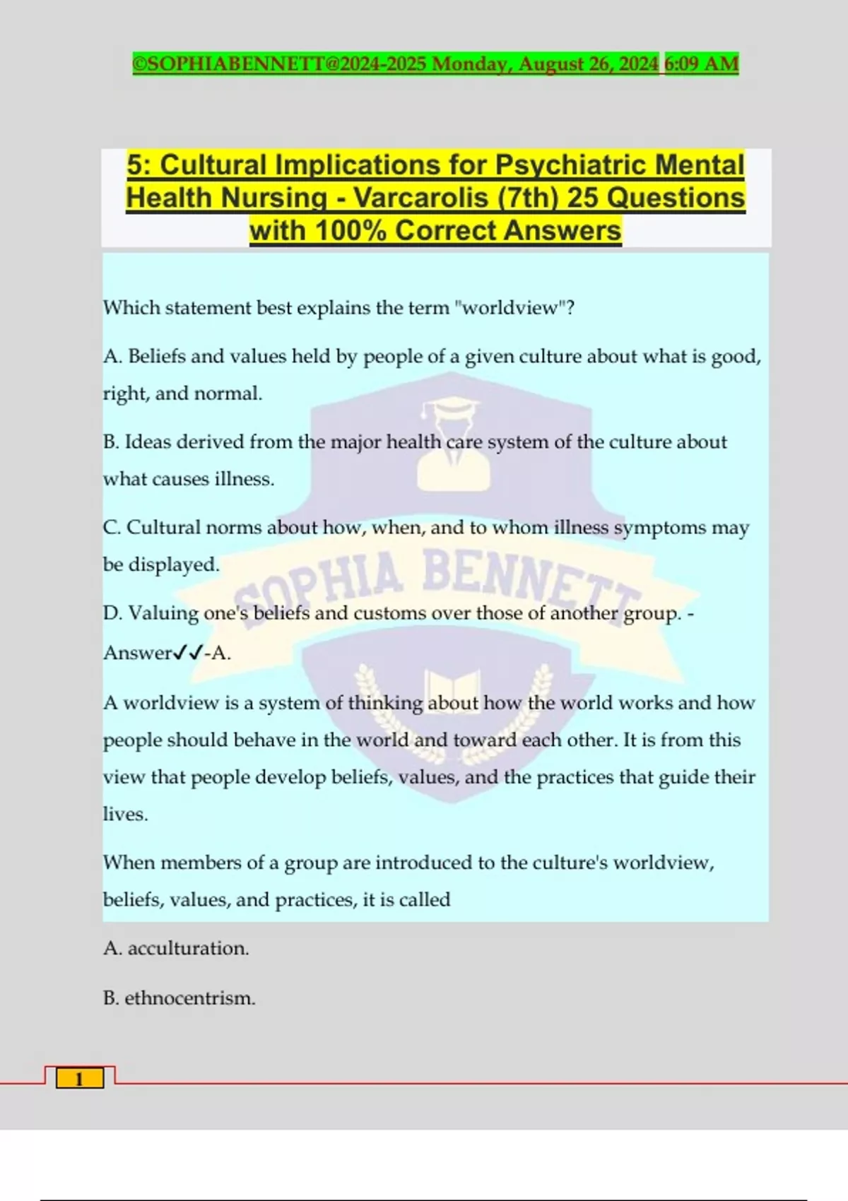 5: Cultural Implications for Psychiatric Mental Health Nursing - Varcarolis (7th) 25 Questions with 100% Correct Answers