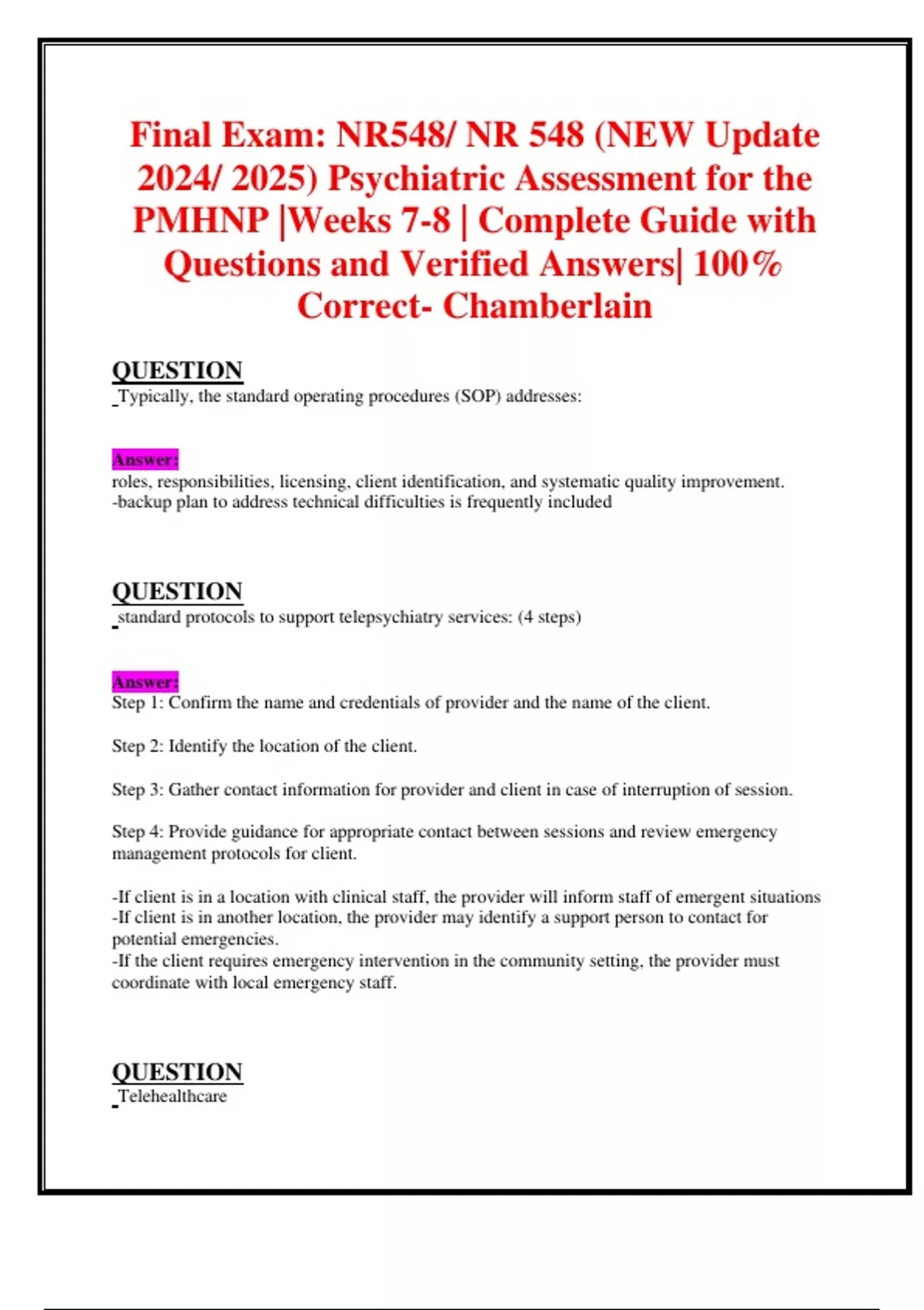 Final Exams: NR548/ NR 548 (NEW Update 2024/ 2025 Updates BUNDLED TOGETHER WITH COMPLETE SOLUTIONS) Psychiatric Assessment for the PMHNP |Questions and Verified Answers| 100% Correct- Chamberlain