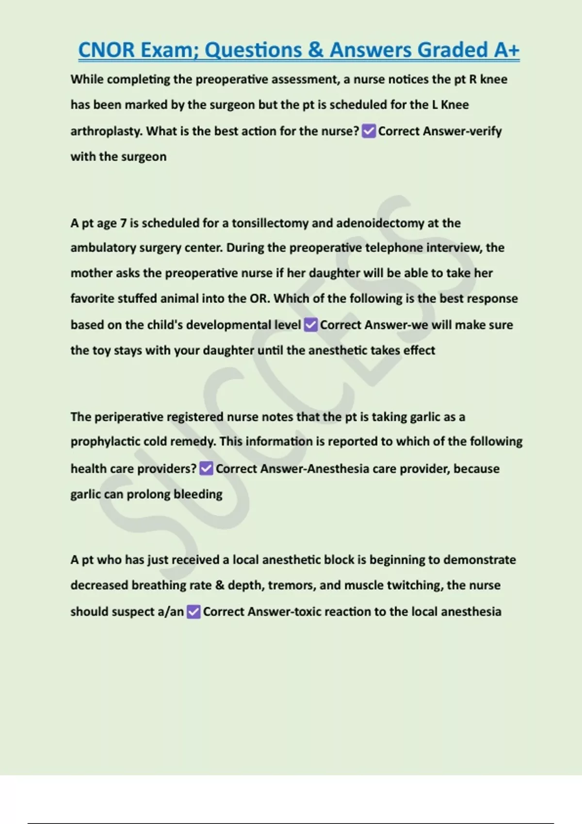 CNOR Exam; Questions & Answers Graded A+ 2 Exam (elaborations) CNOR Exam; Questions with Complete Solutions 3 Exam (elaborations) 100 Question CNOR Practice Exam; Questions with Complete Solutions 4 Exam (elaborations) CNOR AORN online test; Questions with Verified Answers 5 Exam (elaborations) CNOR 200 Question Practice; Questions with Verifie