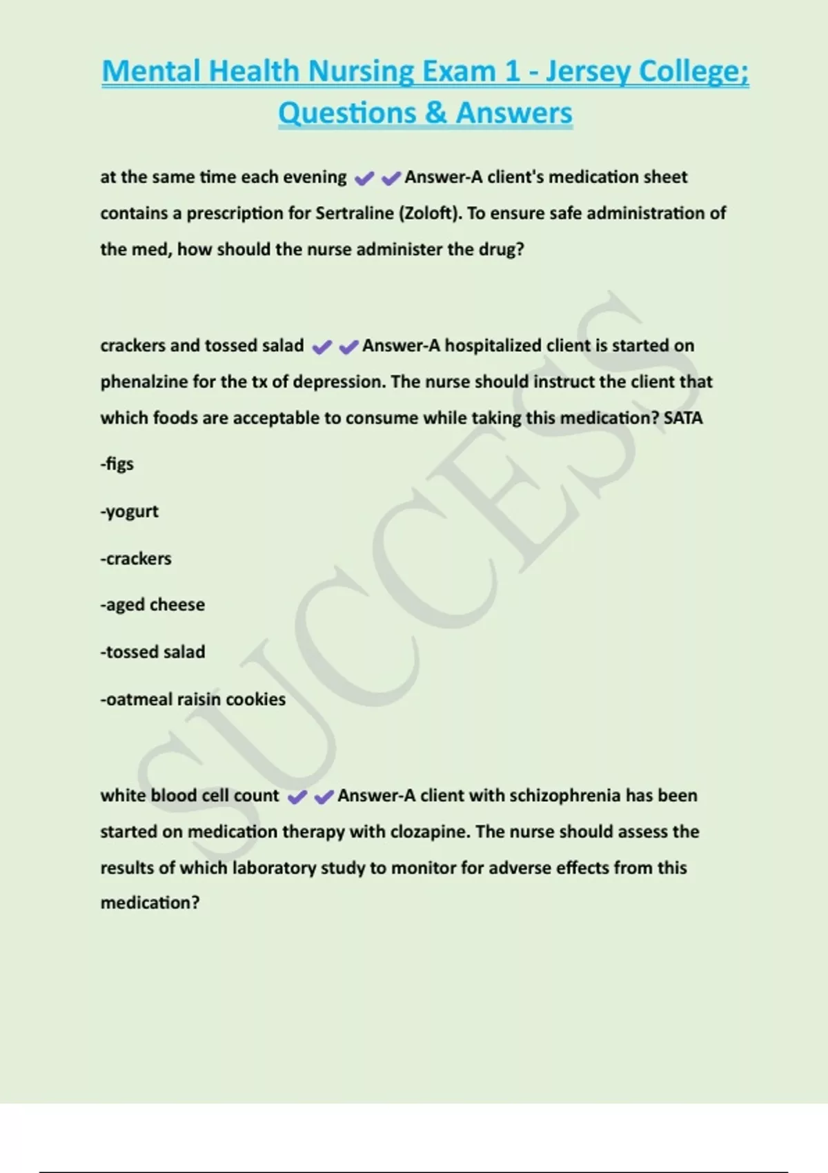 Mental Health Nursing Exam 2 - Jersey College Questions & Answers