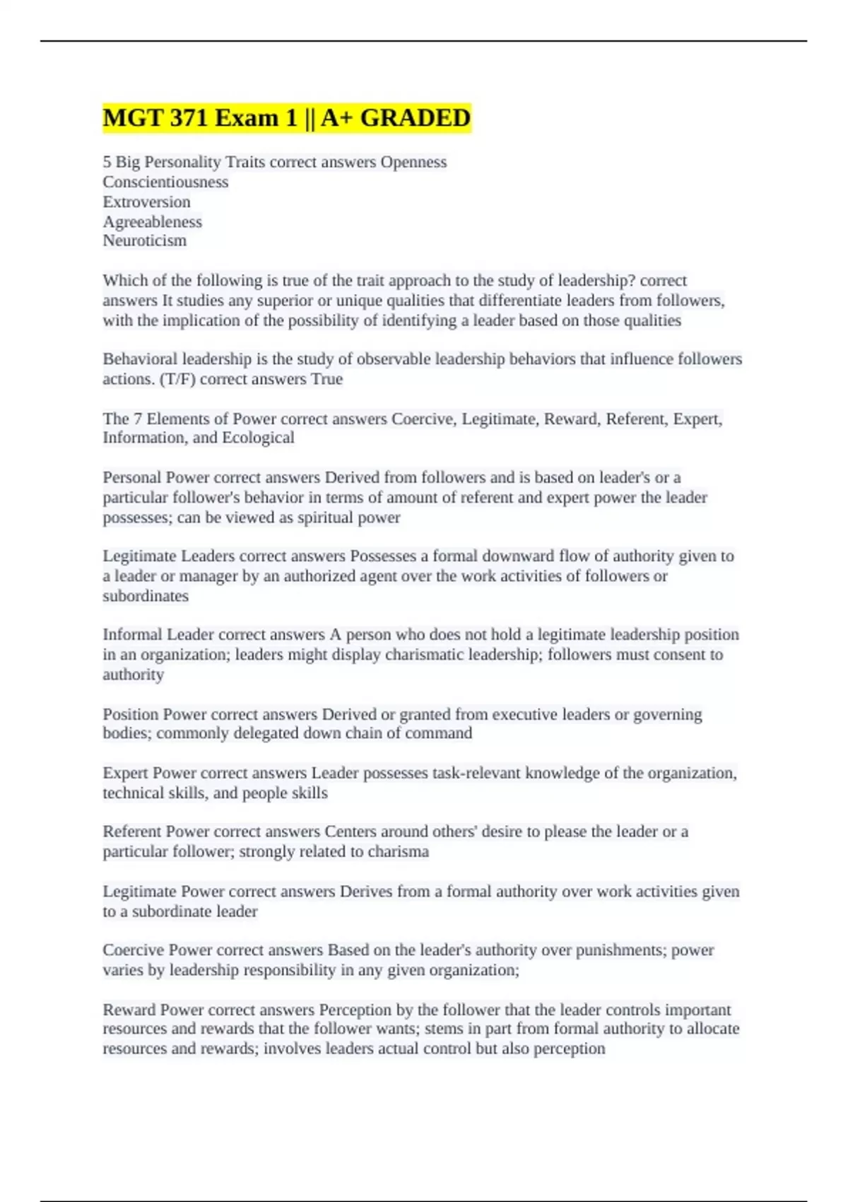 MGT 371 || QUESTIONS WITH COMPLETE ANSWERS!!