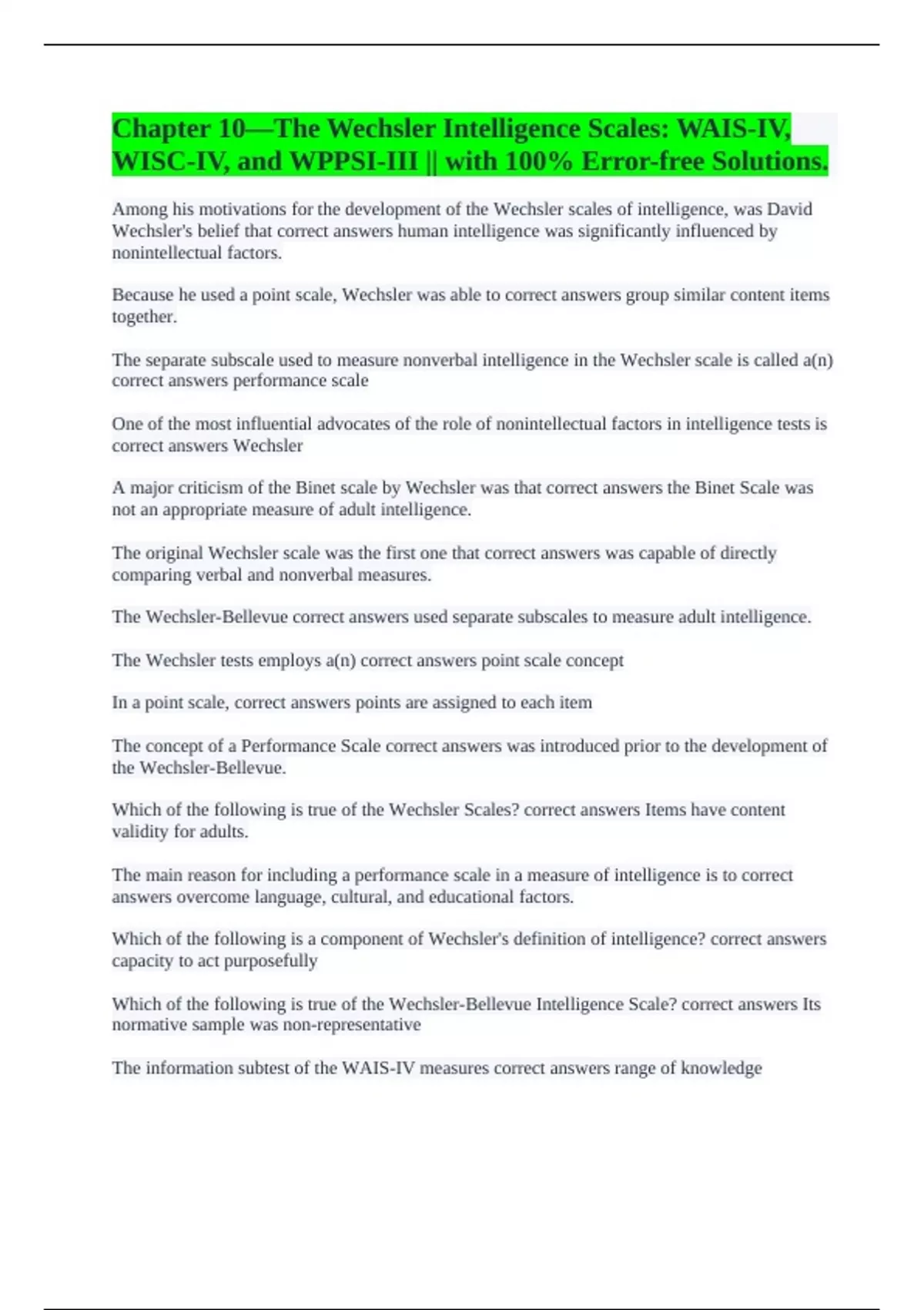 WAIS-IV || with 100% Errorless Answers. Chapter 10—The Wechsler Intelligence Scales: WAIS-IV, WISC-IV, and WPPSI-III || with 100% Error-free Solutions. Essentials of WAIS-IV Chapter. 1-9 Questions || All Questions Answered Correctly. Psychometric Chapter 10: The Wechsler Intelligence Scales: WAIS-IV, WISC-V, and WPPSI-IV || with Accurate Answers 10