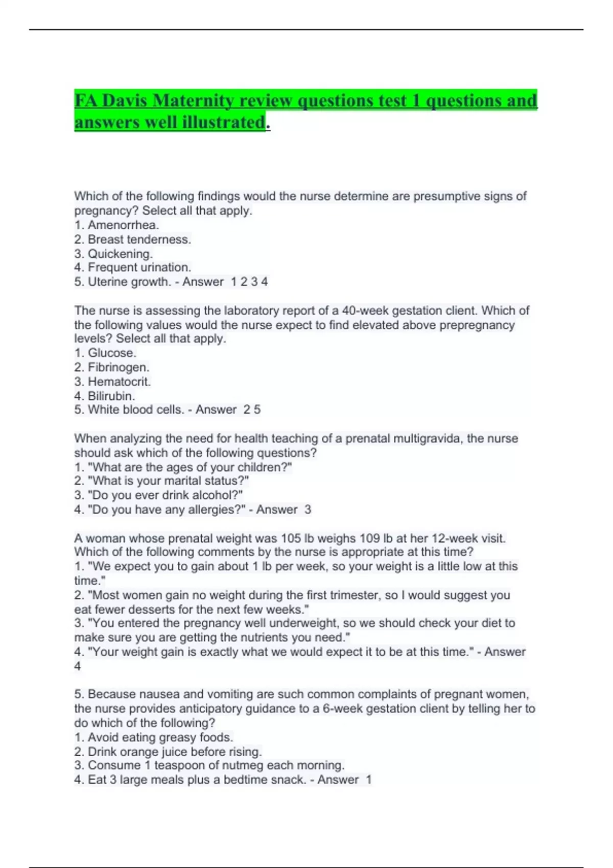 FA Davis Maternity review questions test 1 questions and answers well illustrated.
