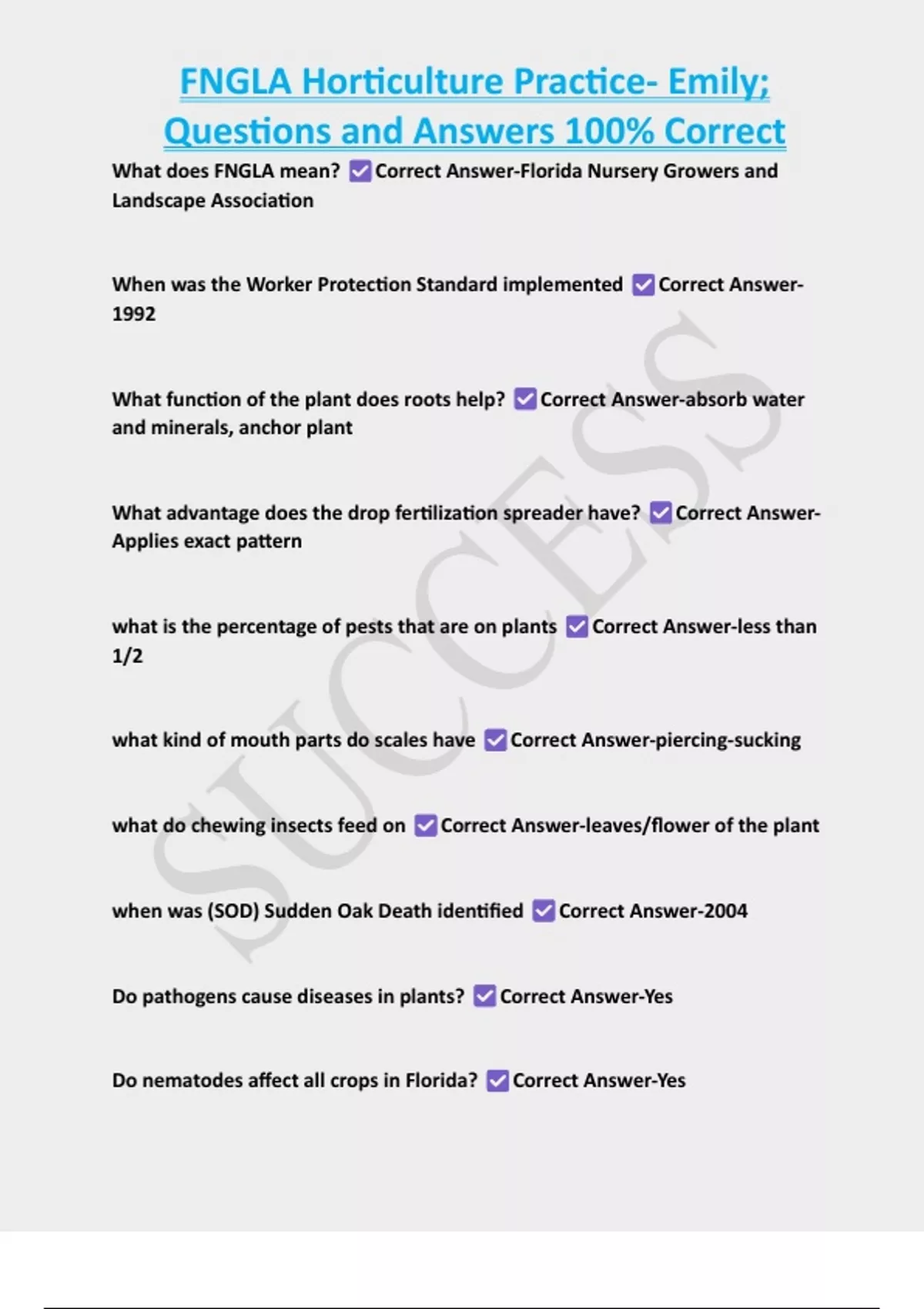 FNGLA Horticulture Practice- Emily; Questions and Answers 100% Correct 2 Exam (elaborations) FNGLA Hort Practices Practice 1; Questions and Answers 100% Pass 3 Exam (elaborations) EXAM: FNGLA Study Guide (1-70); Questions and Answers 100% Pass 4 Exam (elaborations) EXAM: FNGLA South Open Book Questions and Answers 100% Correct 5 Exam (elaborati