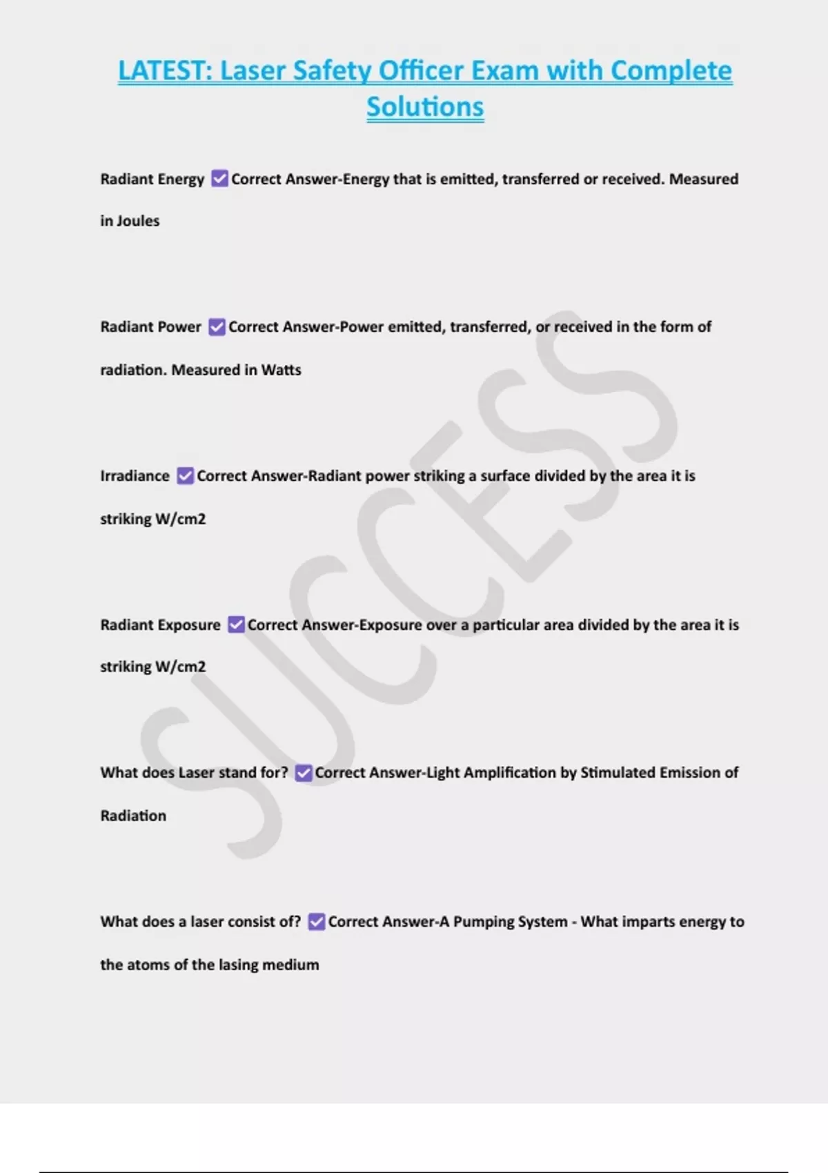 LATEST: Laser Safety Officer Exam with Complete Solutions 2 Exam (elaborations) LATEST: Laser Safety Officer – BEO Test Questions and Answers 100% Pass 3 Exam (elaborations) LASER Safety Exam ; Questions with Complete Solutions 4 Exam (elaborations) EXAM: Laser Safety Officer (AF)|133 Questions with Verified Solutions 5 Exam (elaborations) EXAM