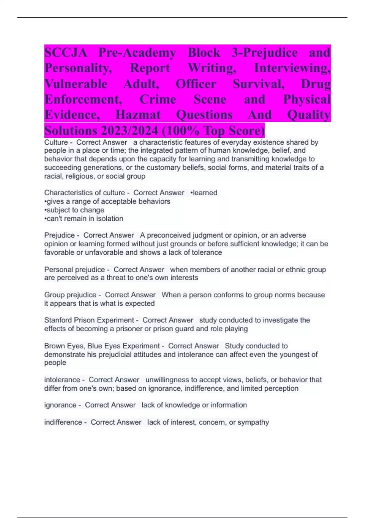 SCCJA Pre-Academy Block 3-Prejudice and Personality, Report Writing, Interviewing, Vulnerable Adult, Officer Survival, Drug Enforcement, Crime Scene and Physical Evidence, Hazmat Questions And Quality Solutions 2023/2024 (100% Top Score)