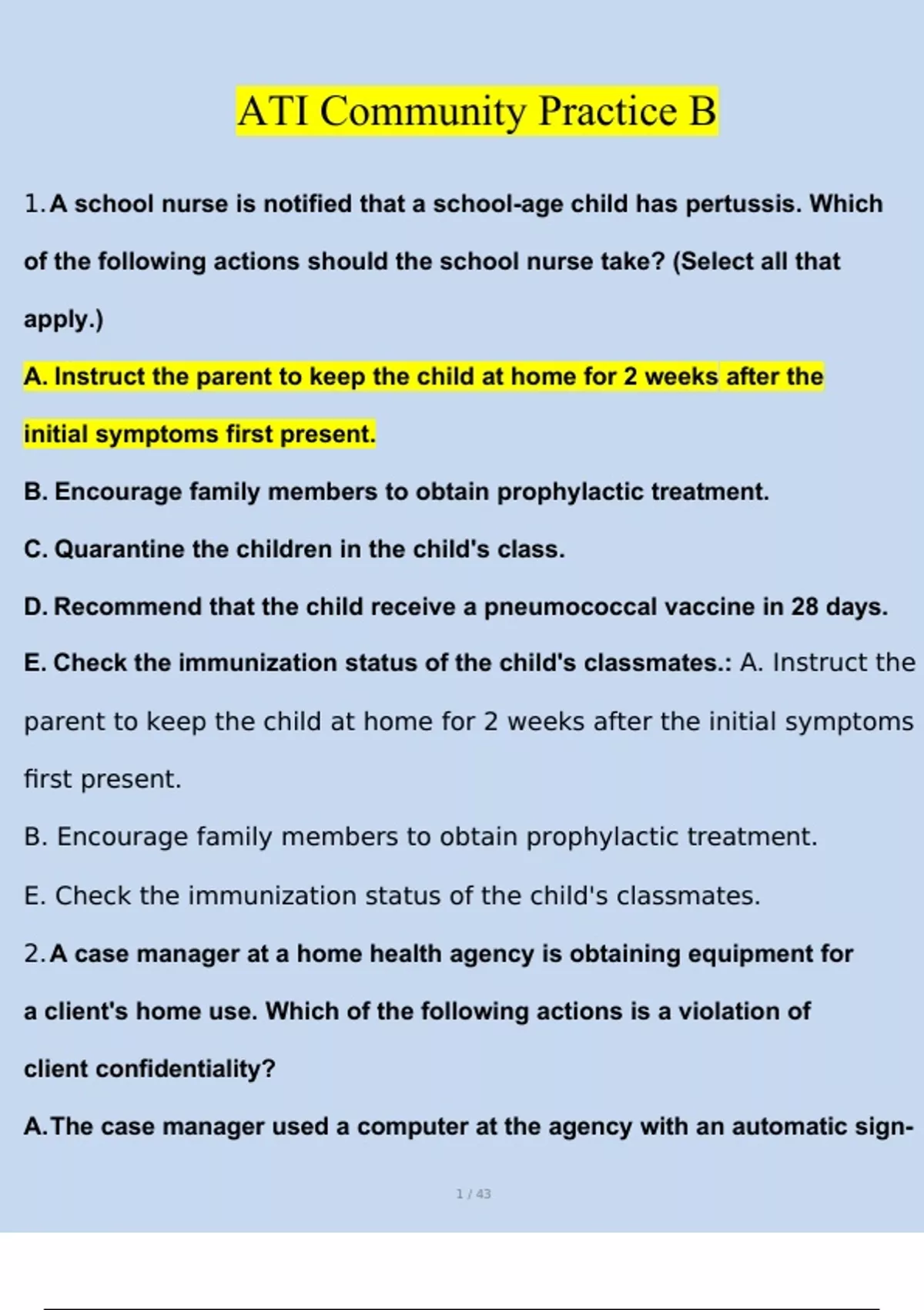 ATI Community Health Proctored Practice Exams BUNDLED ATI Community Health Proctored Practice Exam A 2024 Questions and Verified Answers, 100% Guarantee Pass ATI Proctored Community Health Exam (2023 / 2024) with NGN Questions and Verified Rationalized An