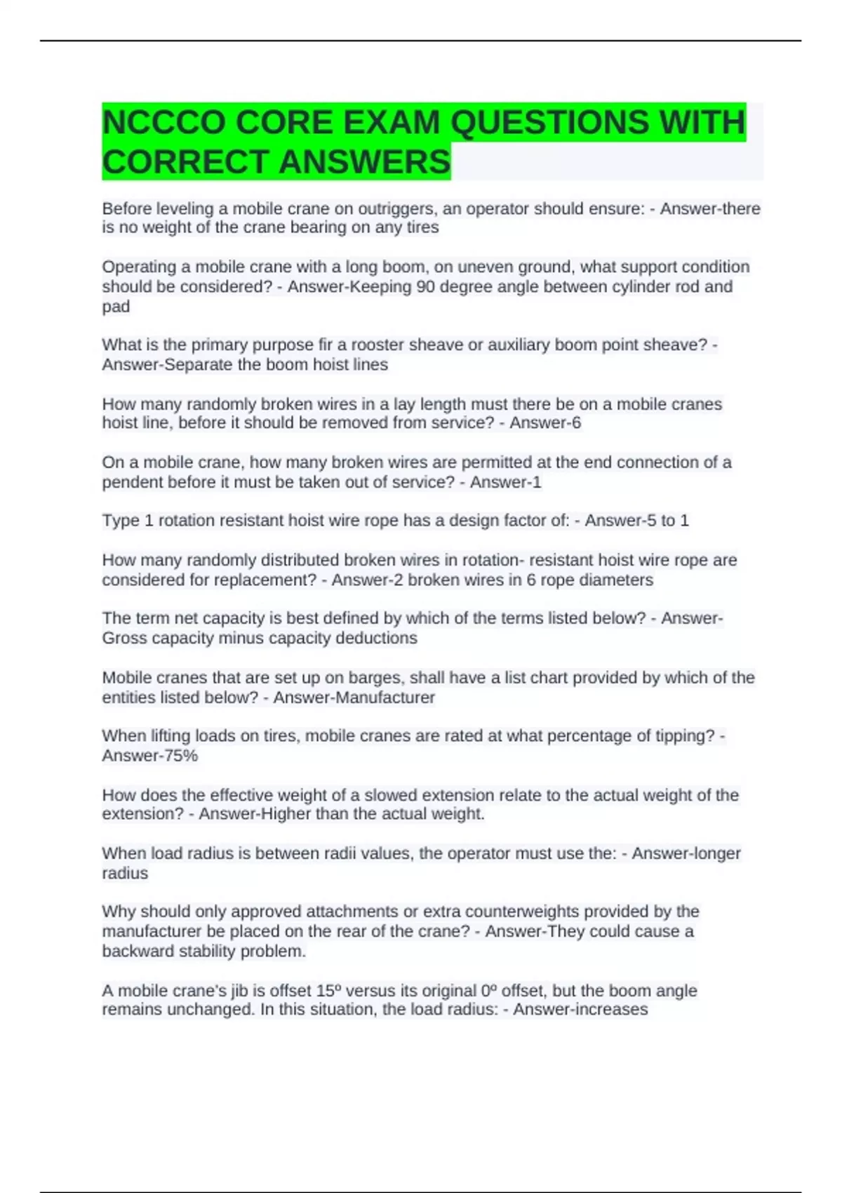 NCCCO CORE EXAM QUESTIONS WITH CORRECT ANSWERS 2 Exam (elaborations) NCCCO EXAM QUESTIONS AND ANSWERS 3 Exam (elaborations) NCCCO LARGE HYDRAULICS B EXAM REVIEW QUESTIONS AND ANSWERS 4 Exam (elaborations) NCCCO MOBILE CRANE EXAM QUESTIONS AND ANSWERS 5 Exam (elaborations) NCCCO PRACTICE EXAM QUESTIONS WITH CORRECT ANSWERS 6 Exam (elaborations)