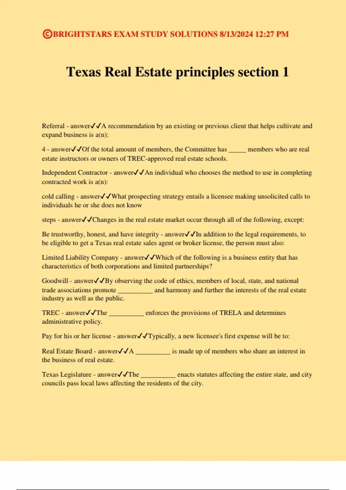 Texas Real Estate Practice Exam Questions With Revised Answers