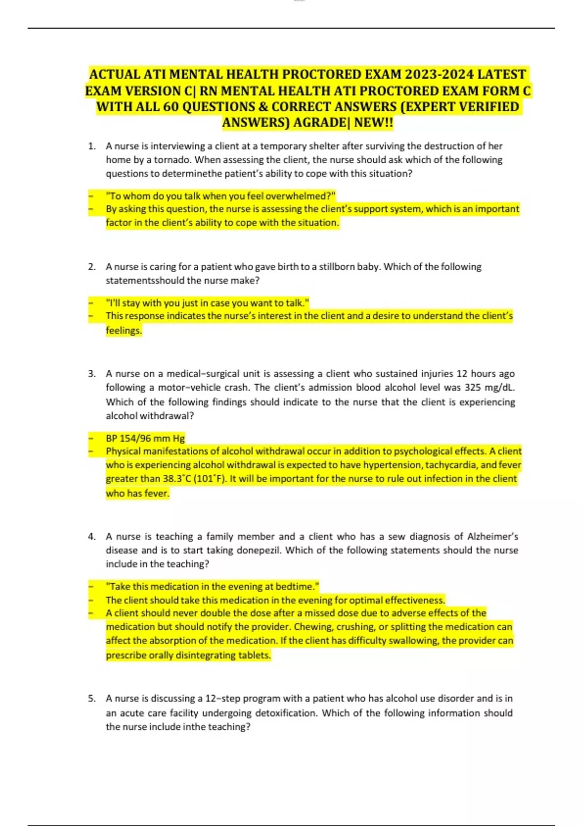 ACTUAL ATI MENTAL HEALTH PROCTORED EXAM LATEST EXAM VERSION C| RN MENTAL HEALTH ATI PROCTORED EXAM FORM C WITH ALL 60 QUESTIONS & CORRECT ANSWERS (EXPERT VERIFIED ANSWERS) AGRADE| NEW!!