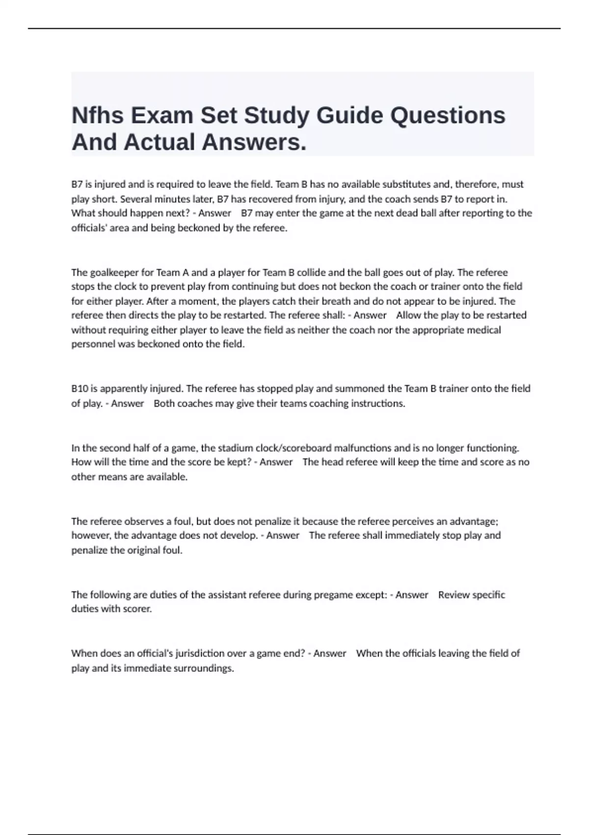 1 Exam (elaborations) NFHS Basketball Rules Exam Pre Questions Well And Correctly Answered. 2 Exam (elaborations) NFHS Softball 2024 Rules Prep Exam Questions 100% Well Answered. 3 Exam (elaborations) NFHS Rules Football Study Guide Exam And Actual Answers. 4 Exam (elaborations) Soccer Officiating Final Exam Questions With Complete Solutions. 5