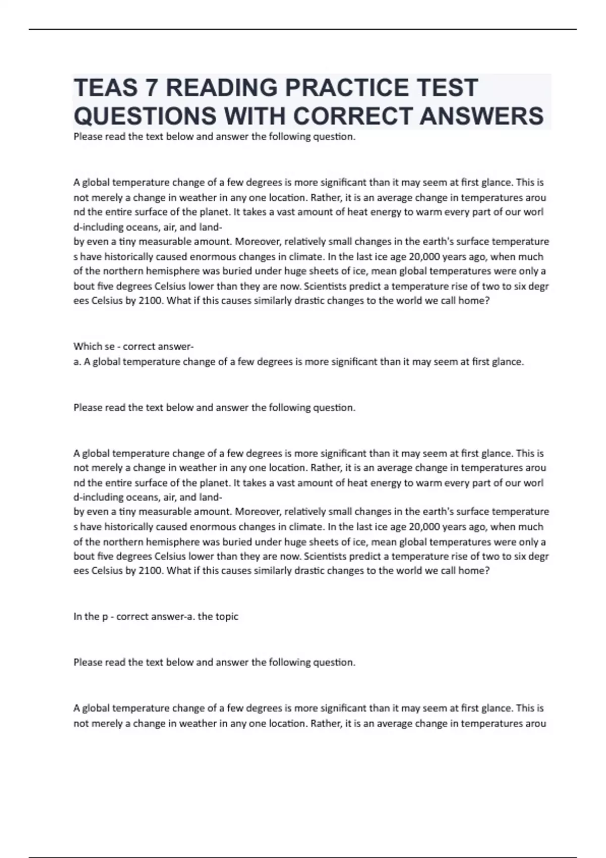 TEAS 7 READING PRACTICE TEST QUESTIONS WITH CORRECT ANSWERS