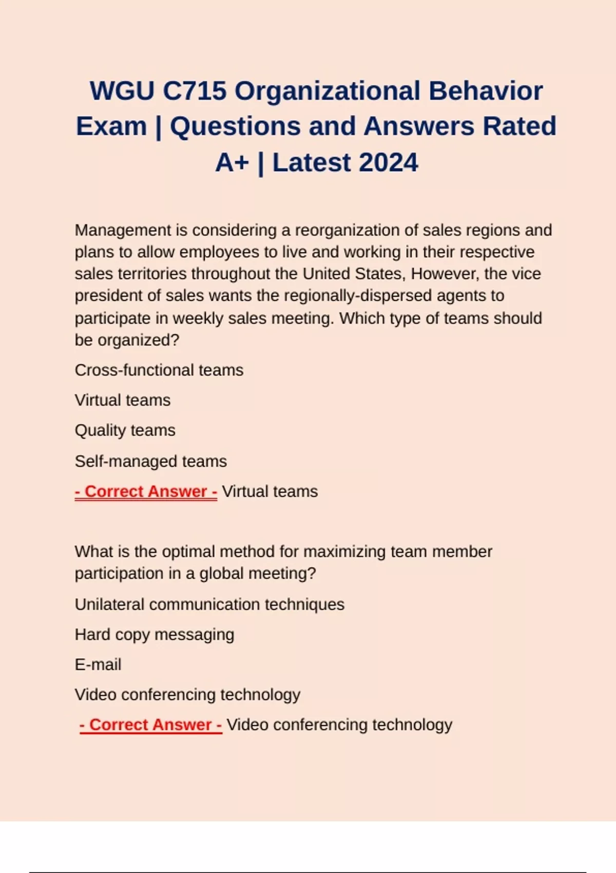 WGU C715 Organizational Behavior Practice Exam Guide | Questions and Answers Rated A+ | Latest 2024