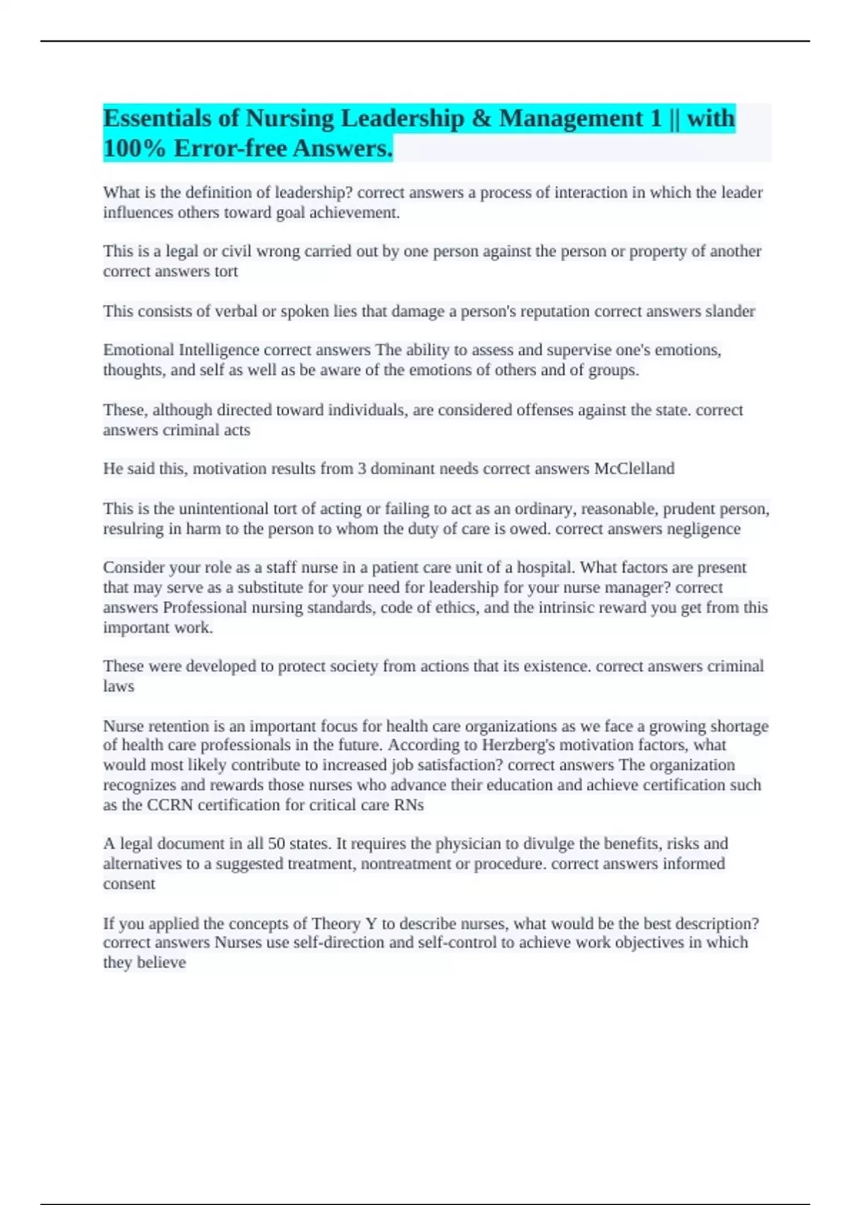 Essentials of Nursing Leadership & Management || A+ Graded Already. Essentials of Nursing Leadership & Management – MINE || A Verified A+ Pass. Essentials of Nursing Leadership CH8 7e || with Errorless Solutions 100%. Essentials of Nursing Leadership and Management Chapters 1-4 || Already Graded A+. Essentials of Nursing Leadership and Management 8