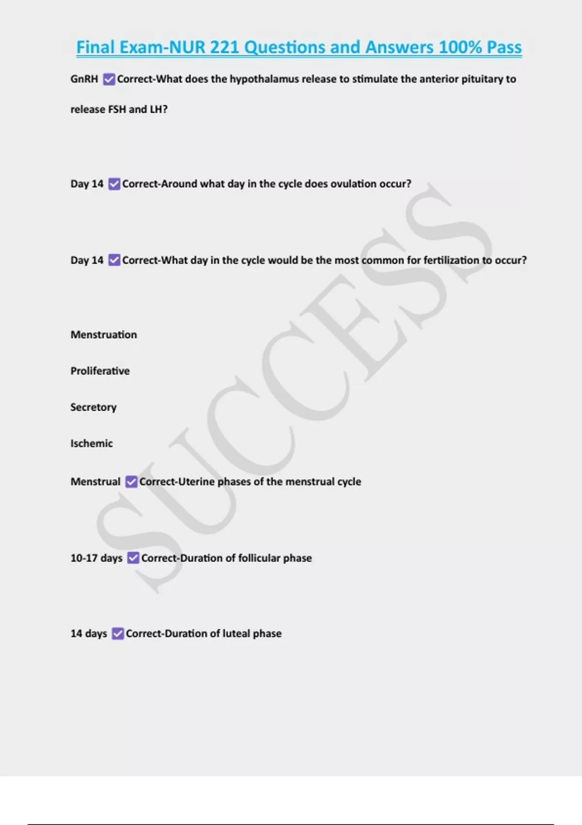 Exam- NURS 221 Test 1 Review Questions with Complete Solutions 11 Exam (elaborations) Exam- NUR 221 Test 1 with Certified Solutions 12 Exam (elaborations) Exam 1- NUR 221 Questions and Answers 100% Correct 13 Exam (elaborations) Exam 3- NUR 221 Kidneys, Urinary System, Male and Female Reproductive Disorders(Qs & As) 14 Exam (elaborations) Exam