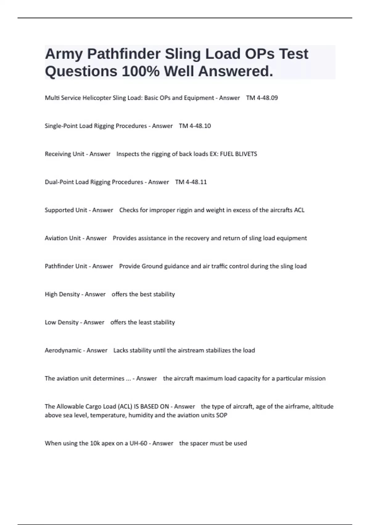 1 Exam (elaborations) Air assault Phase 2 test FY2021 Exam Questions And Actual Answers. 2 Exam (elaborations) Pathfinder-Sling Load Deficiencies Sheet Study Guide Exam Fully Answered. 3 Exam (elaborations) Pathfinder Sling Loads Midterm Exam Questions And Correct Answers. 4 Exam (elaborations) Fort Campbell Pathfinder School: Sling Load Written