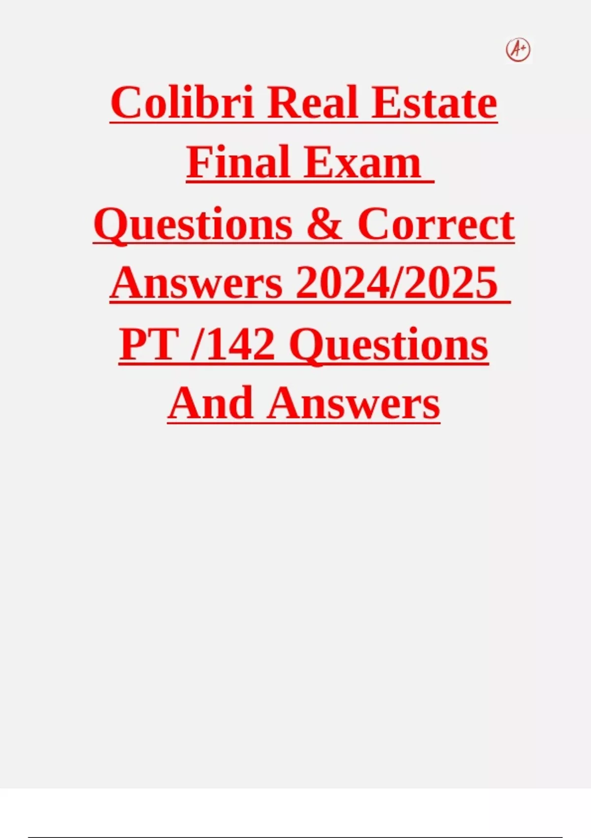 Colibri Real Estate Final Exam Complete Solution Package Latest Update 2024/2025