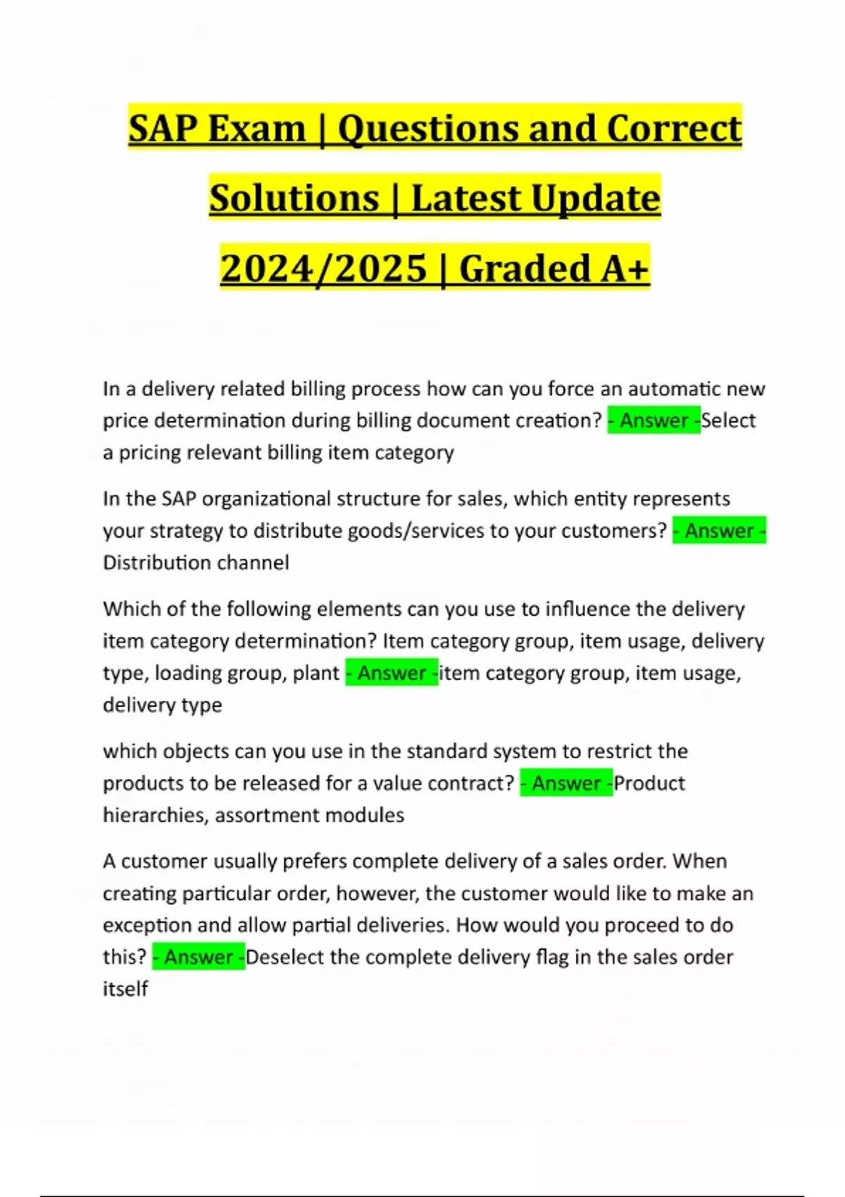 SAP Exam | Questions and Correct Solutions | Latest Update 2024/2025 | Graded A+