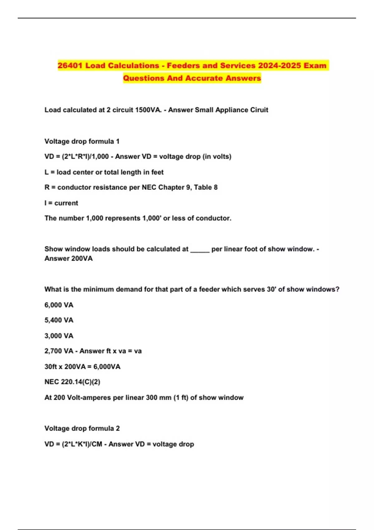 26401-17 Load Calculations - Feeders And Services Latest Exam With Complete Solutions