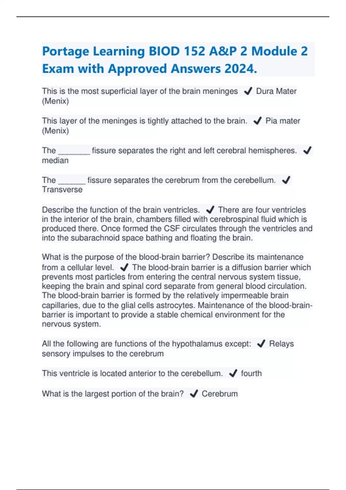 BIOD152/BIOD 152 Essential Human Anatomy & Physiology II: Portage Learning Exams PACKAGE DEAL| BUNDLE contains the latest Module 1, 2, 3, 4, 5, 6, 7 and Final Exams with Verified solutions - Everything you need to pass BIOD 152 is here!