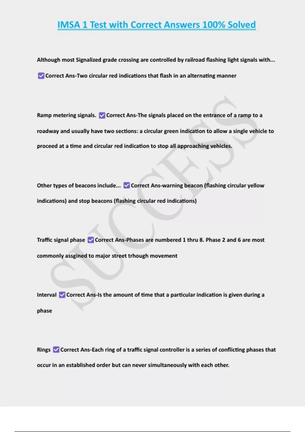ISMA Traffic Signal Technician II Exam with Solutions 2 Exam (elaborations) IMSA 1 Test with Correct Answers 100% Solved 3 Exam (elaborations) IMSA Workzone Safety Exam with Verified Solutions 4 Exam (elaborations) Imsa Traffic Tech 1 Exam; Questions and Answers 5 Exam (elaborations) IMSA Traffic Signal Level 1 Exam with Complete Solutions 6 E