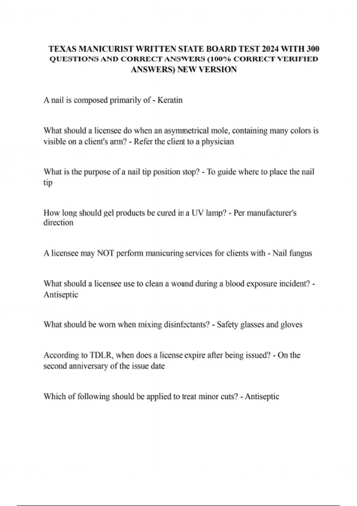 TEXAS MANICURIST WRITTEN STATE BOARD TEST 2024 WITH 300 QUESTIONS AND CORRECT ANSWERS (100% CORRECT VERIFIED ANSWERS) NEW VERSION
