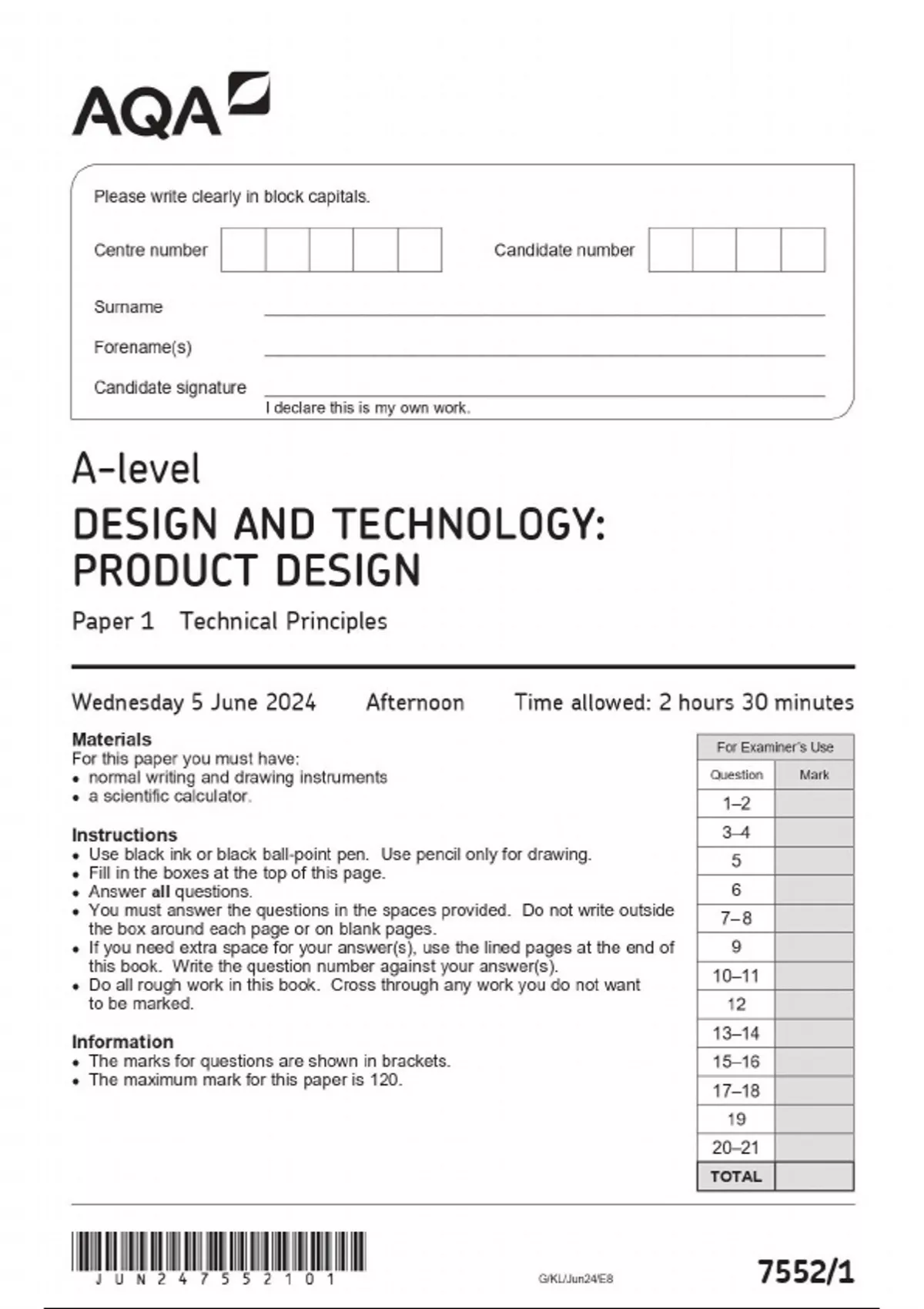 AQA A-level DESIGN AND TECHNOLOGY: FASHION AND TEXTILES Paper 1 Question Paper Technical Principles Wednesday 5 June 2024