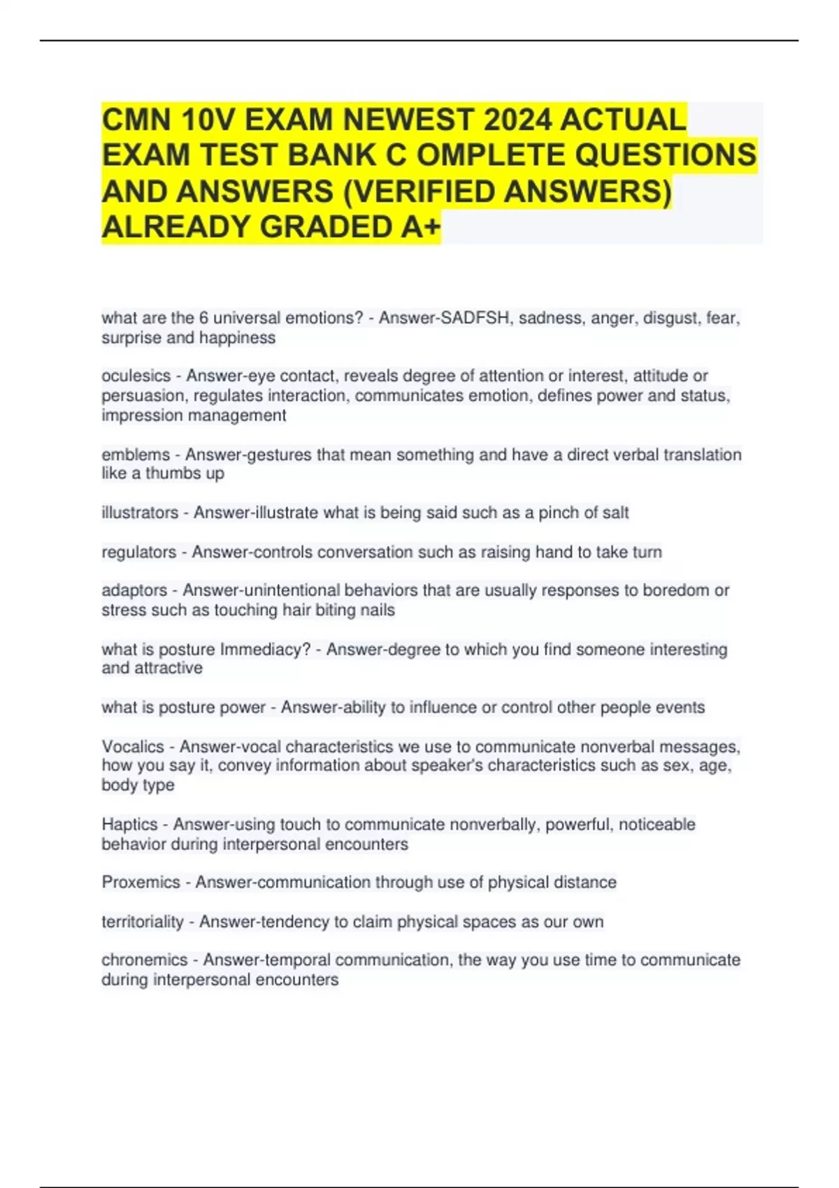 CMN 10V – FINAL EXAM QUESTIONS WITH REVISED AND UPDATED ANSWERS GRADED A+ 2 Exam (elaborations) CMN 10V EXAM LATEST VERSION – REAL EXAM QUESTIONS – GRADED A+ 3 Exam (elaborations) CMN 10V EXAM NEWEST 2024 ACTUAL EXAM TEST BANK C OMPLETE QUESTIONS AND ANSWERS (VERIFIED ANSWERS) ALREADY GRADED A+ 4 Exam (elaborations) CMN 10V EXAM TEST BANK 150 QU