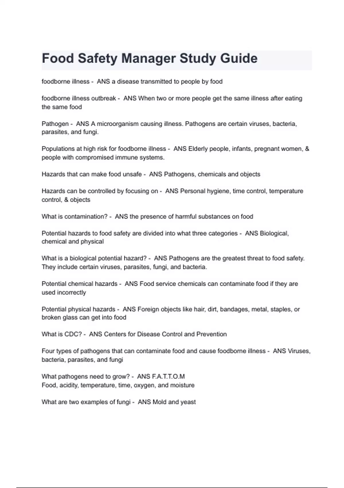 Food Safety Manager Study Guide Questions and Answers 2024( A+ GRADED 100% VERIFIED).