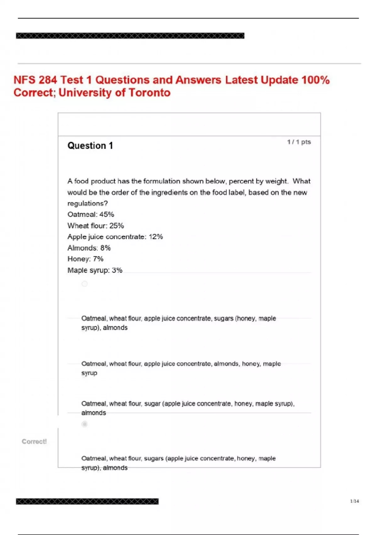 NFS 284 Test 1 Questions and Answers Latest Update 100% Correct; University of Toronto NFS 284 Test 2 Actual Questions and Answers 100% Correct; University of Toronto NFS 284 TEST 4 - FINAL EXAM/60 Actual Questions and Answers 100% Correct; University of Toronto