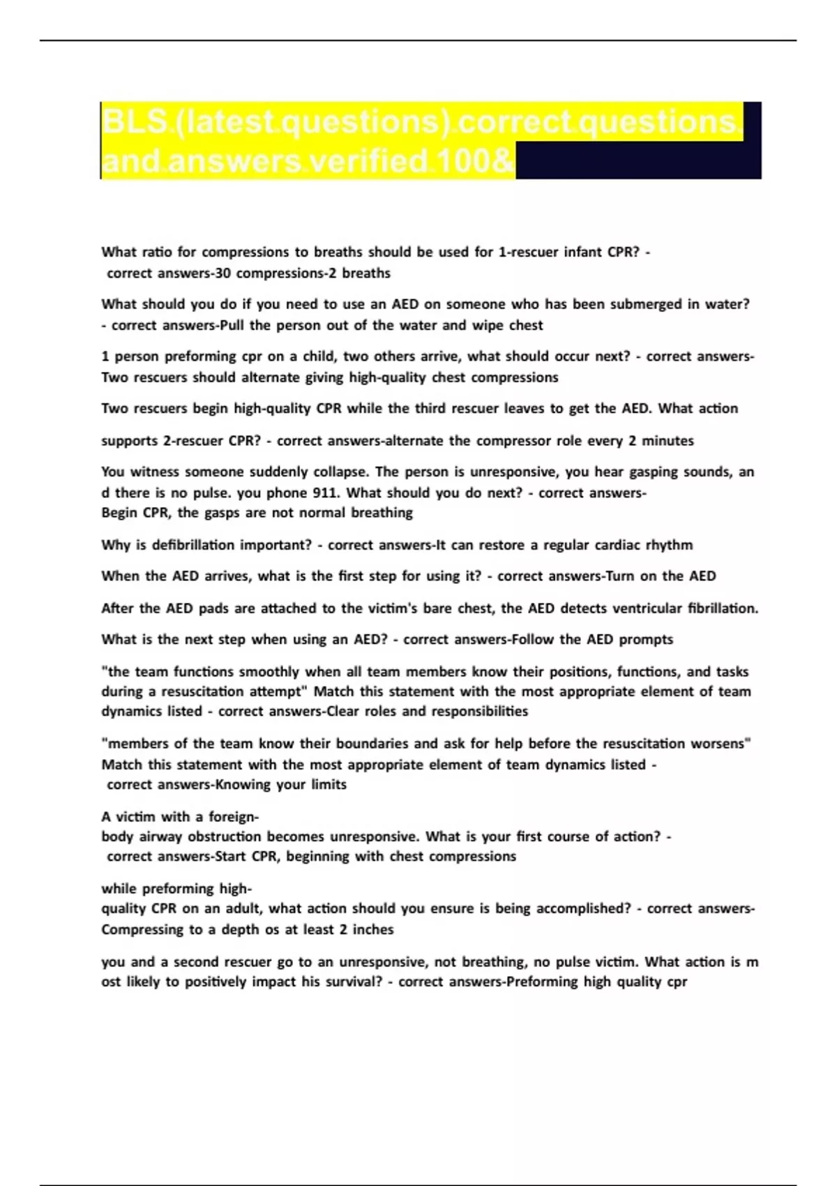 BLS Quiz Questions and answers correct/verified download red cross/bls cpr/exam/correct answers verified 100% basic life support exam a/BLS CPR exam/verified questions and answers HSI YMCA BLS EXAM - 2023/2024 bundled document