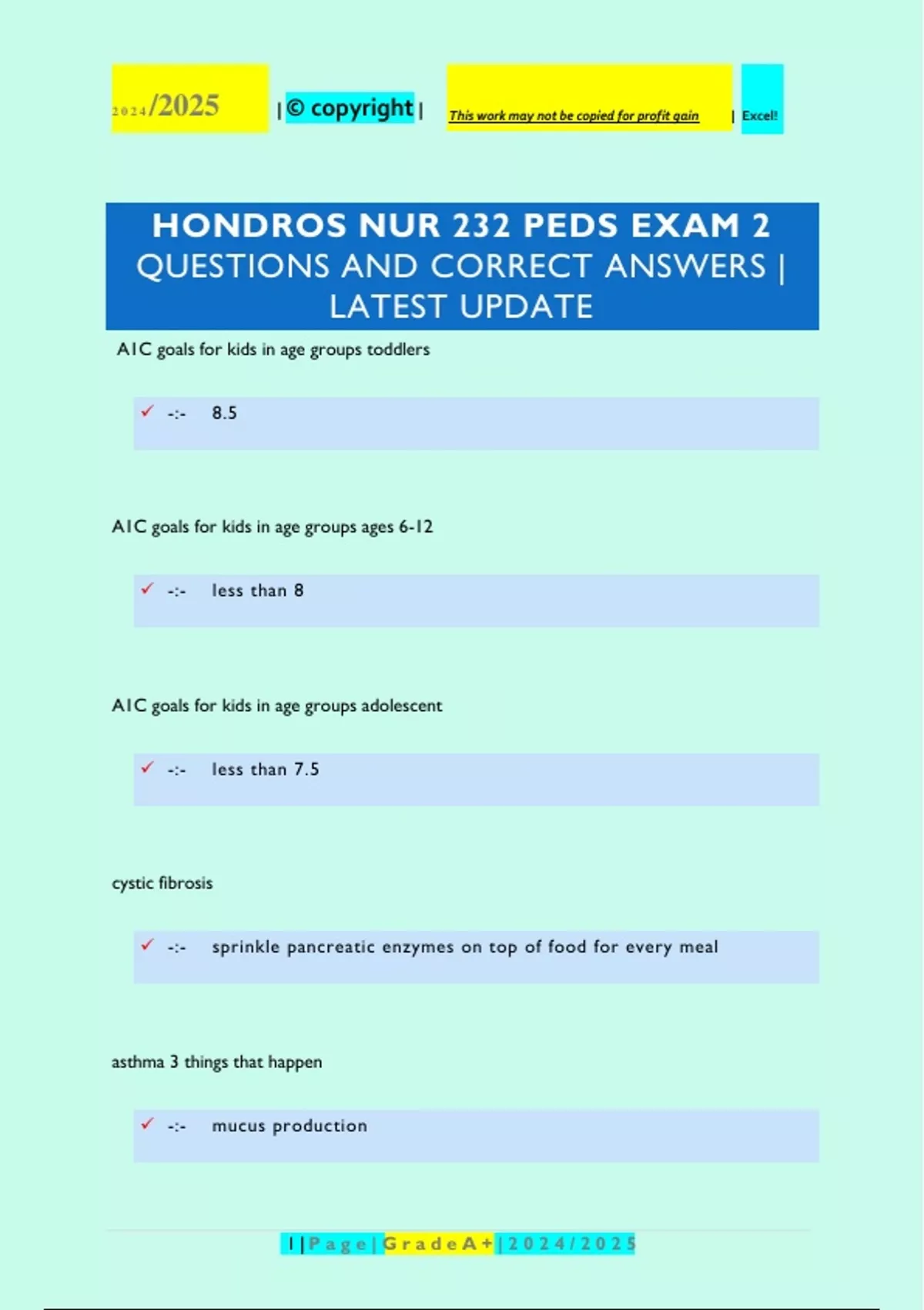 HONDROS NUR 232 PEDS EXAM 2 QUESTIONS AND CORRECT ANSWERS | LATEST UPDATE