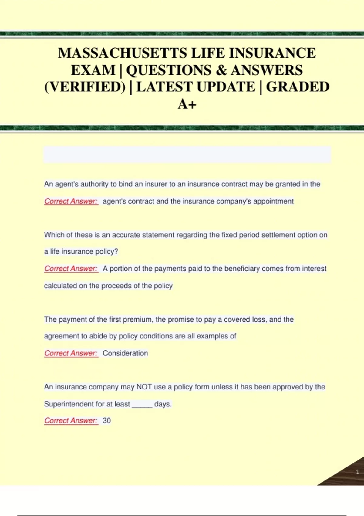 MASSACHUSETTS LIFE INSURANCE EXAM | QUESTIONS & ANSWERS (VERIFIED) | LATEST UPDATE | GRADED A+