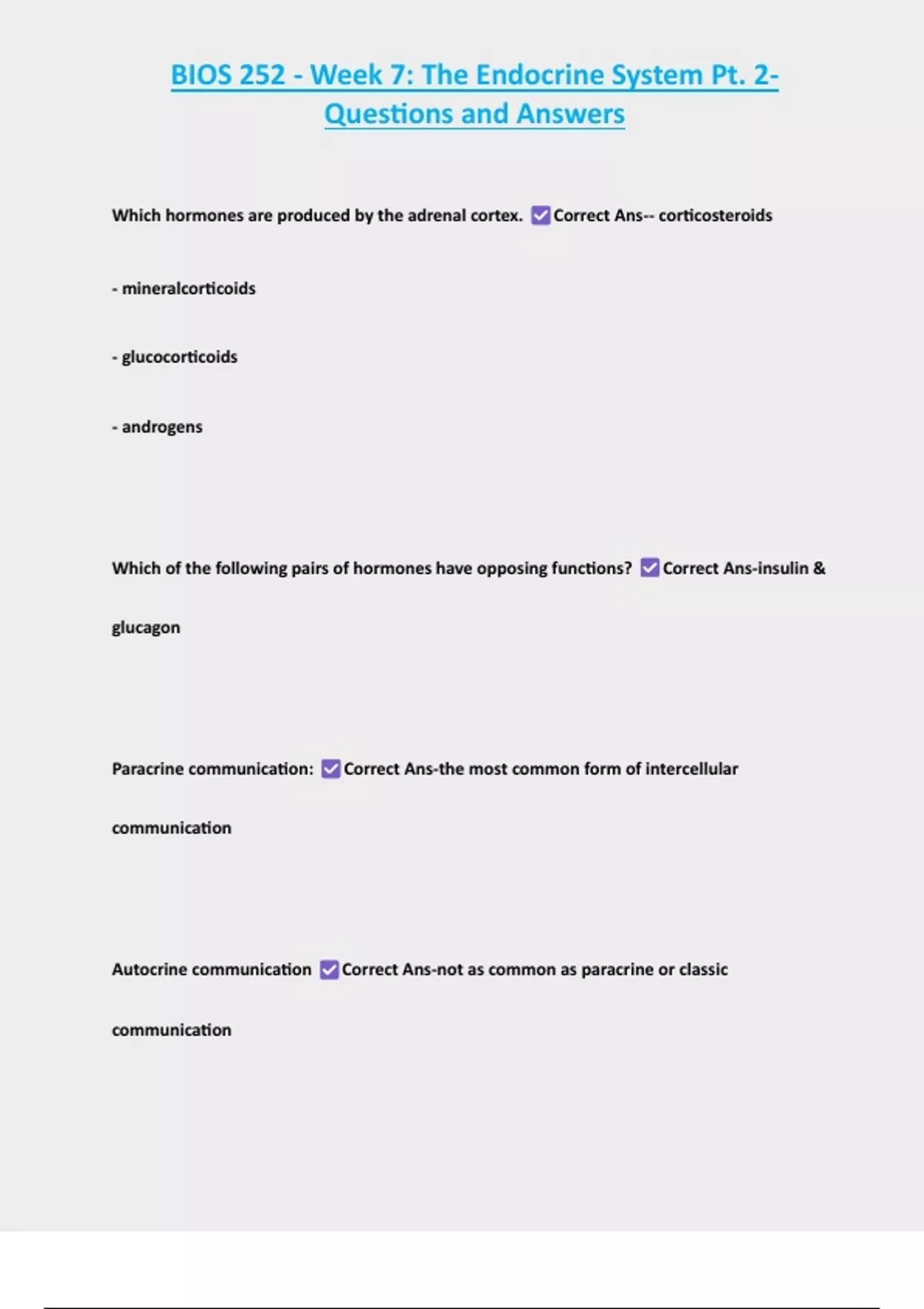 BIO252 weeks 3 and 4-Test with Complete Solutions 2 Exam (elaborations) BIOS 252 - Week 6: The Endocrine System Pt. 1- Questions and Answers 3 Exam (elaborations) BIOS 252: Week 6 - Endocrine System Part 1|Edapt Questions + Review Qs & As 4 Exam (elaborations) BIOS 252 - Week 7: The Endocrine System Pt. 2- Questions and Answer
