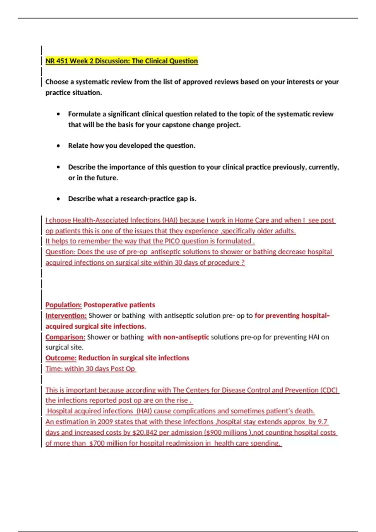 NR 451 Week 2 Discussion, The Clinical Question Chamberlain College 2024/2025