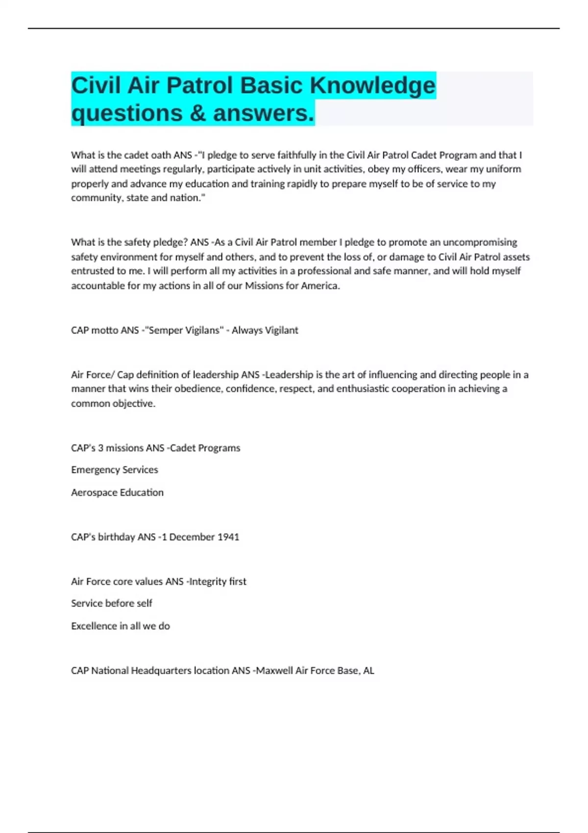CIVIL AIR PATROL LEADERSHIP PACKAGE DEAL QUESTIONS WITH ACCURATE ANSWERS Civil air patrol CAP Leadership and basic questions & answers