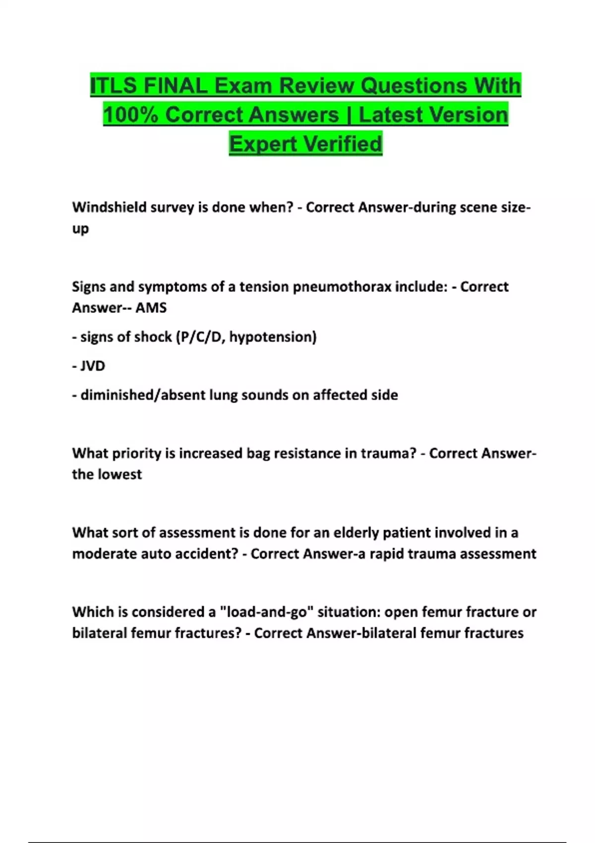 ITLS Exam Questions & Answers | 100% Correct Answers | Verified | Latest 2024 Version ITLS Exam Questions With 100% Correct Answers 2024 ITLS Advanced Pre-Test (9th Edition - Version 9.1) Questions & Answers | 100% Correct Answers | Verified | Latest 2024 (ITLS) International Trauma Life Support Exam Questions With 100% Correct Answers 2024 ITLS