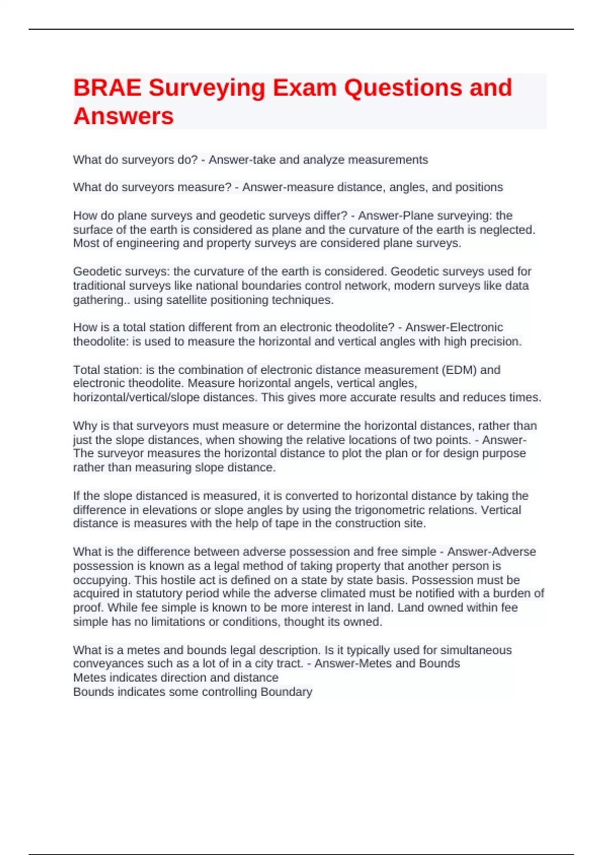 Exam (elaborations) Surveying Exam Questions and Answers Exam (elaborations) Surveying Exam Questions with Latest Update Exam (elaborations) Surveying Exam Questions with Latest Update Exam (elaborations) Surveying Exam Questions with Verified Answers Exam (elaborations) TTU Surveying Final Exam Questions with Correct Answers Exam (elabo