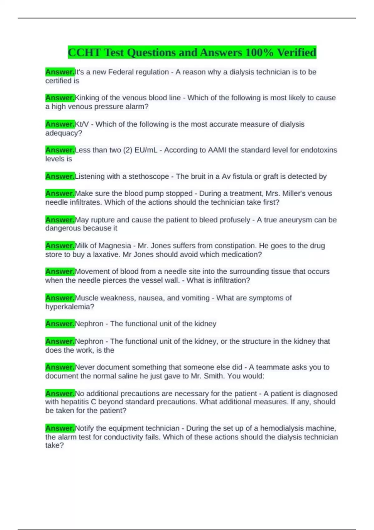 CCHT Test Questions and Answers 100% Verified