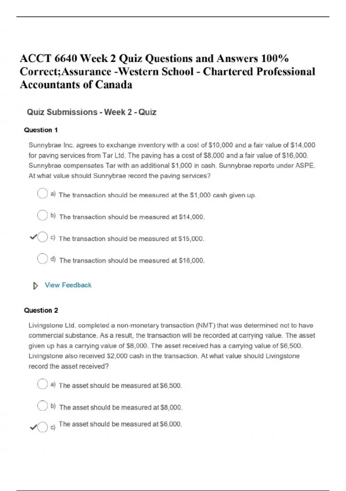 ACCT 6640 Week 2-week 8 Bundled Quizzes;Western School - Chartered Professional Accountants of Canada 100% Verified Solutions