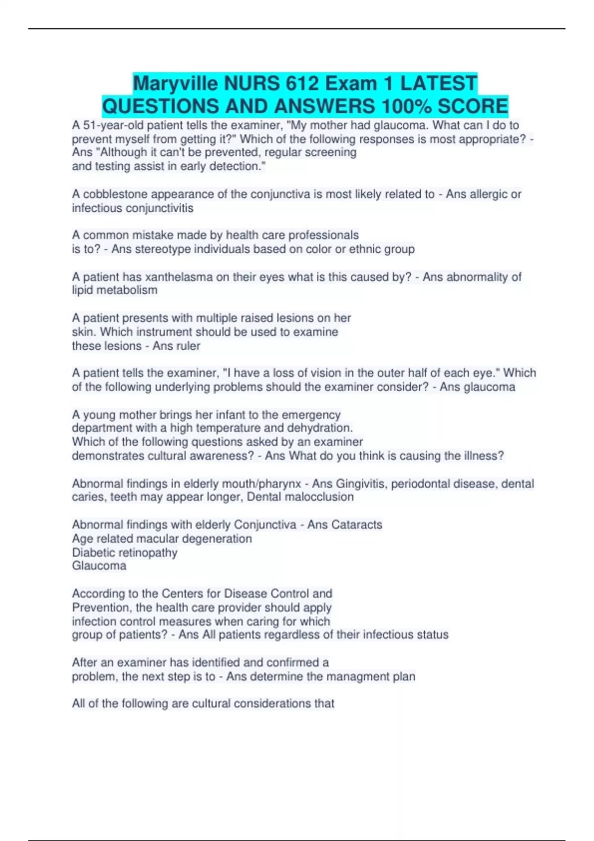 Maryville NURS 612 Exam 1 & 2 LATEST QUESTIONS AND ANSWERS 100% SCORE