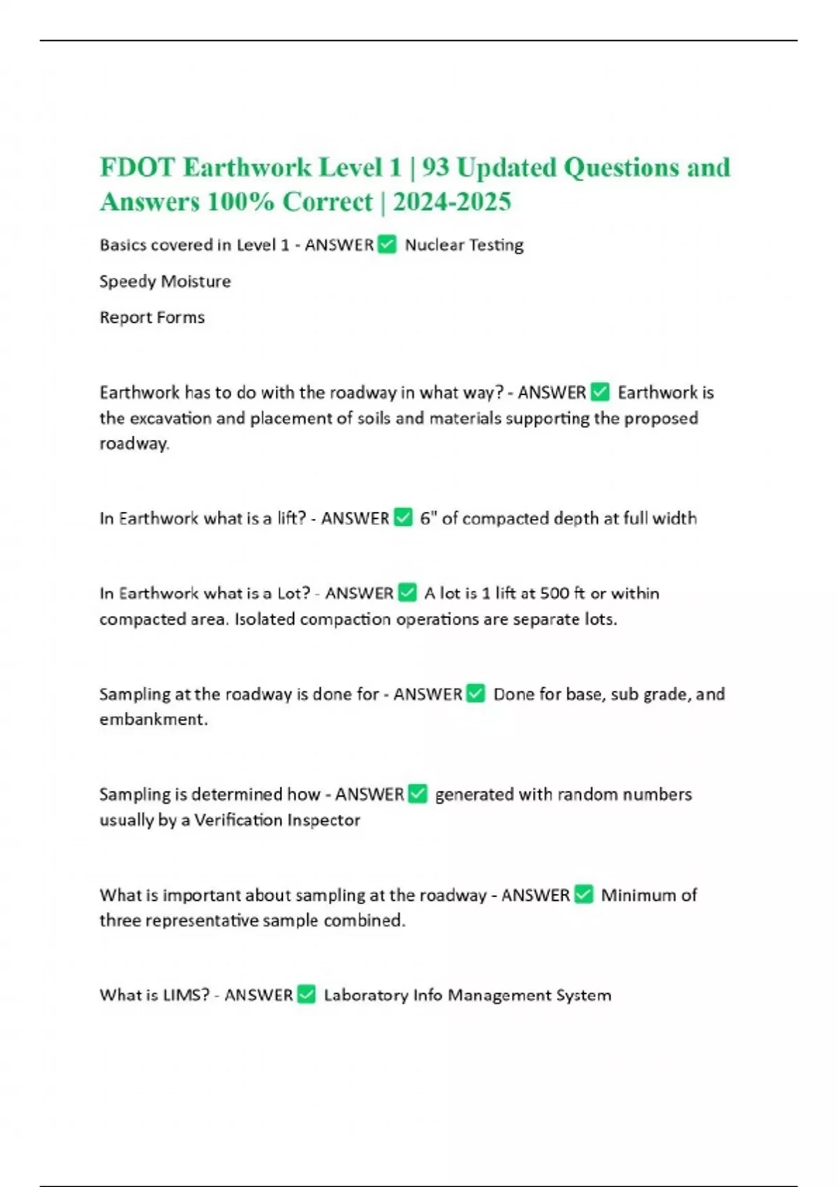FDOT Earthwork Level 1 | 93 Updated Questions and Answers 100% Correct |