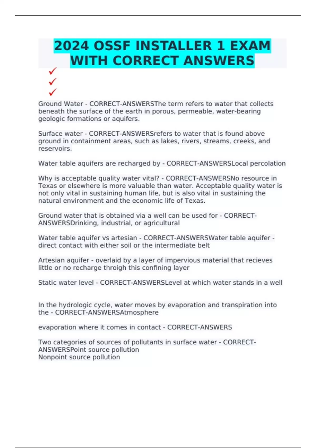 2024 OSSF INSTALLER 1 EXAM WITH CORRECT ANSWERS 2024 INSTALLER I EXAM WITH CORRECT ANSWERS 2024 COMMERCIAL SEPTIC SYSTEM INSTALLER EXAM WITH CORRECT ANSWERS 2024 FIELD MEAS AND SKETCHING FINAL EXAM WITH CORRECT ANSWERS 2024 DESIGNATED REPRESENTATIVE OSSF EXAM WITH CORRECT ANSWERS 2024 OSSF MODULE 1EXAM WITH CORRECT ANSWERS 2024 OSSF RULES AND R