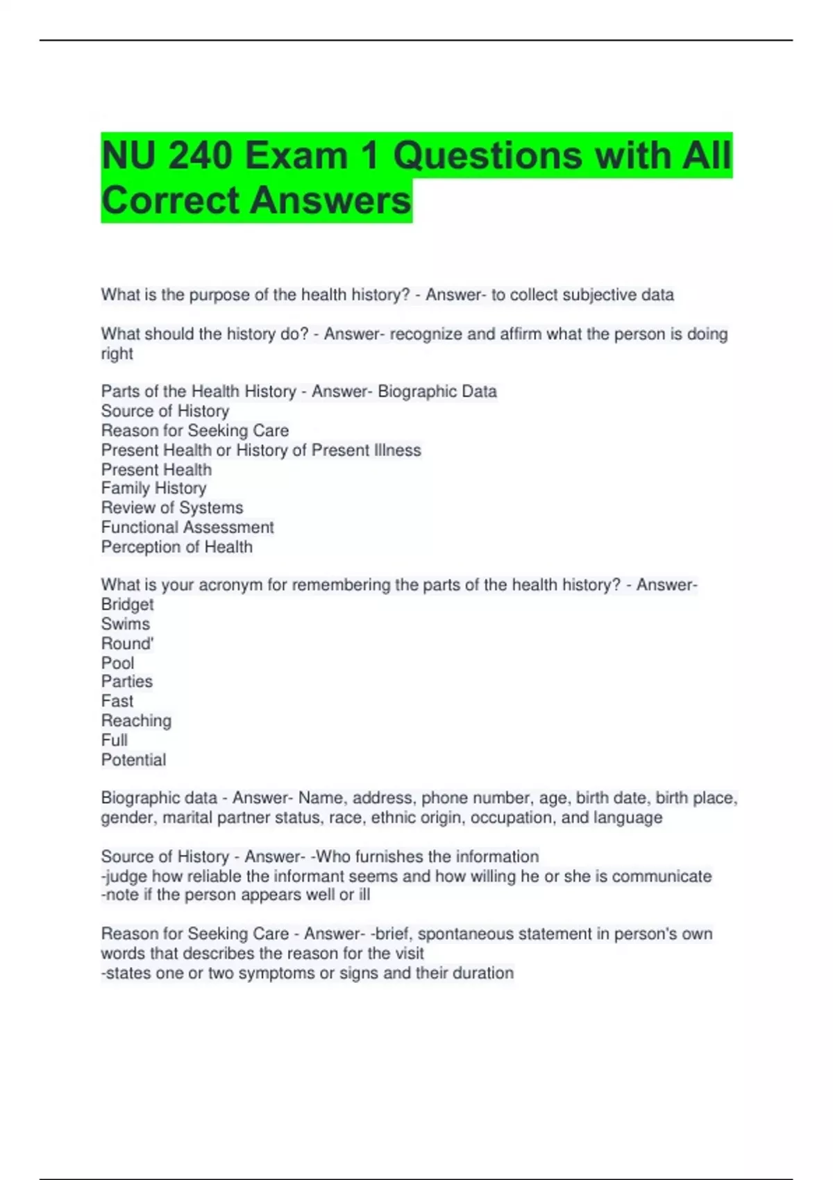 NU 240 Exam 1 Questions with All Correct Answers 2 Exam (elaborations) NU 240 Exam 2 Test Bank Questions with 100% Correct Answers 3 Exam (elaborations) NU 240 Gerontology Exam 1 Questions with All Correct Answers 4 Exam (elaborations) NU240 Exam 3 Questions with All Correct Answers 5 Exam (elaborations) NU240 Ch3 Review Questions with Correct